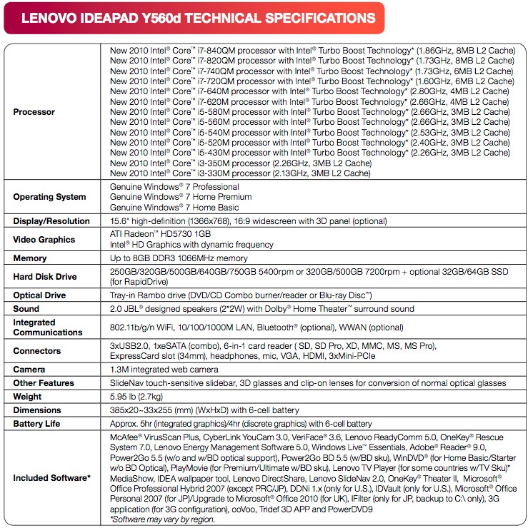 The 15.6-inch Y560d 3D-enabled multimedia laptop, with its High-Def 16:9 widescreen and polarizer glasses, provides the optimal 3-dimensional experience when combined with compatible 3D movies and games.
