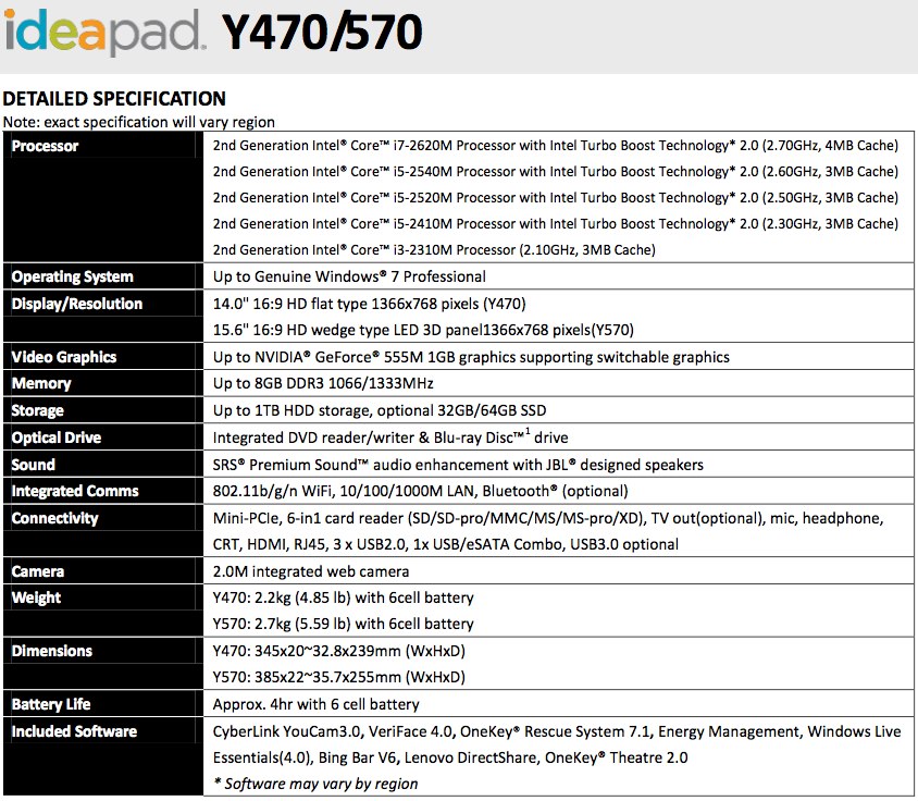 There's also OneKey Theatre II, for automatic DSP, and JBL speakers, together with NVIDIA 3D Vision support with the bundled 3D glasses. The Y470 has a 14-inch 1366 x 768 display while the U570 gets a 15.6-inch panel (at the same resolution); storage is up to 1TB of HDD with an optional 32GB or 64GB SSD, along with a Blu-ray reader/DVD burner combo.