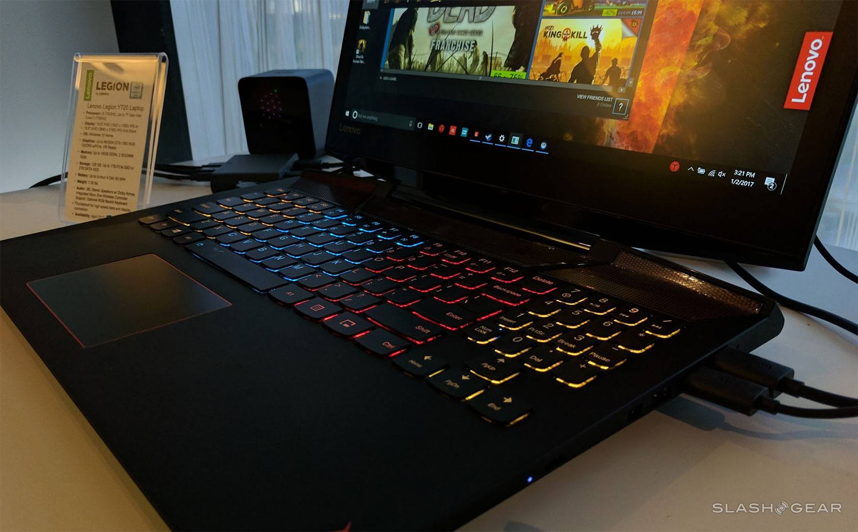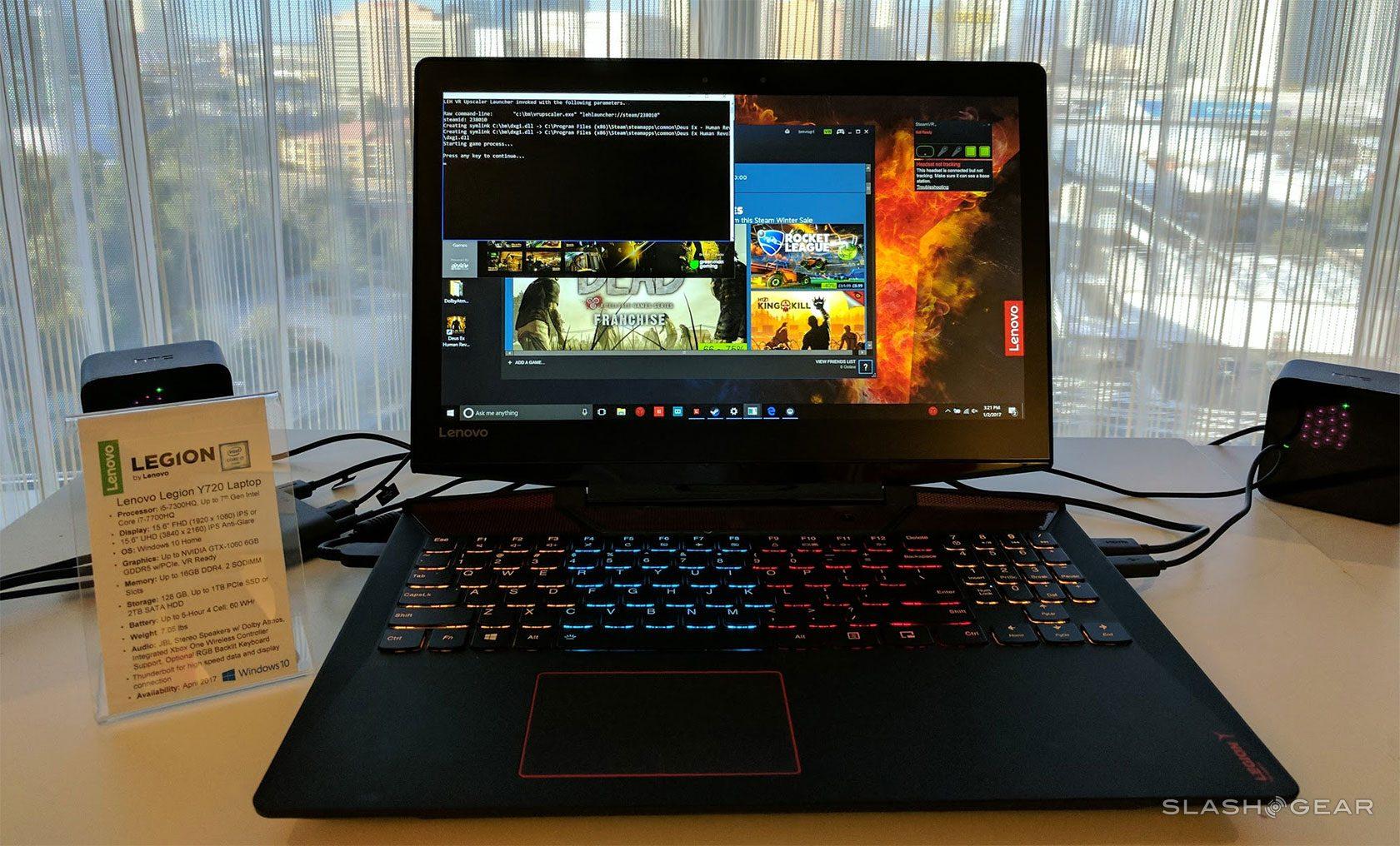 Below you'll see a gallery of photos we took during our first hands-on with the Legion Y720. Here you'll see the HTC Vive connected to the machine with its two lightboxes to the left and right of the notebook. Light-up keyboard abound, as well.