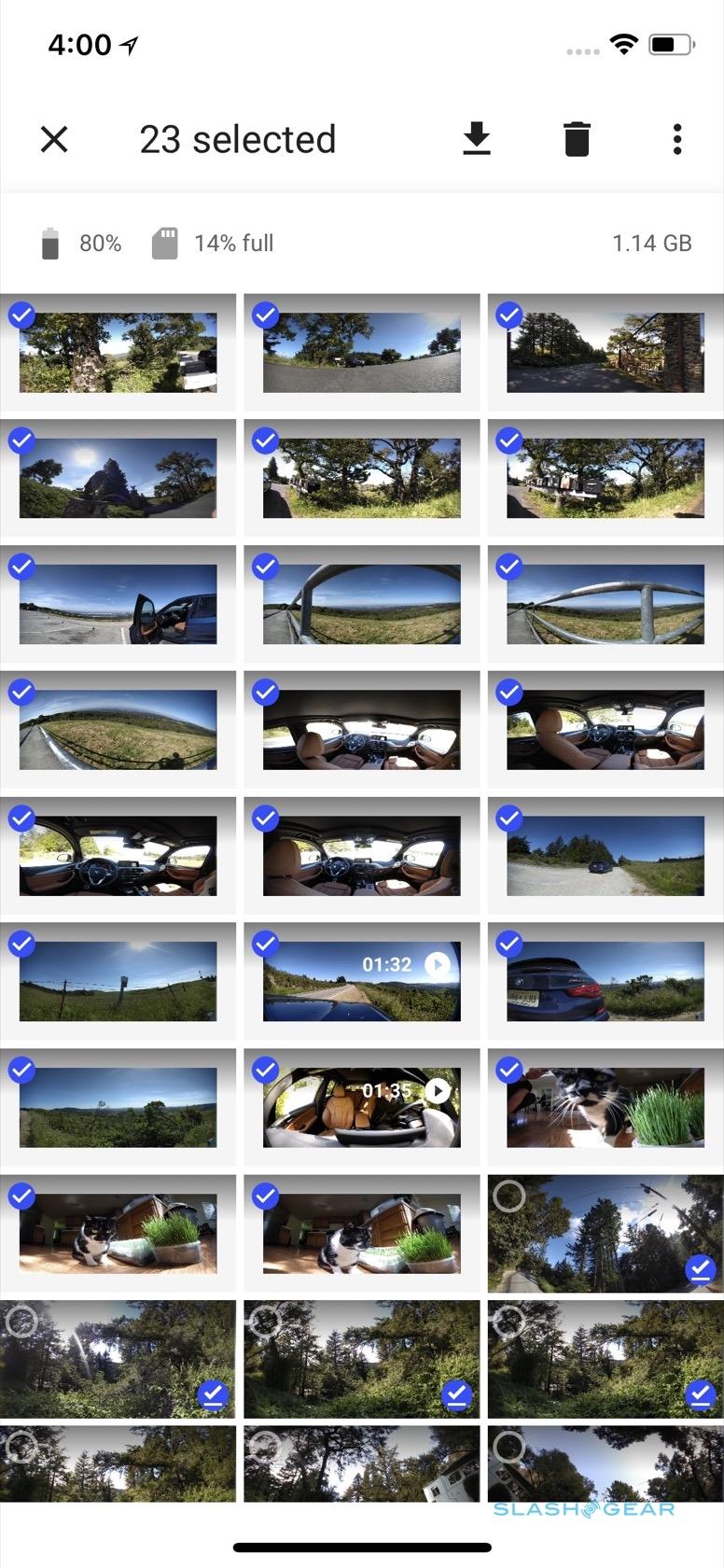 The Mirage Camera can, in theory, use its WiFi to upload images directly to Google Photos. However I struggled to get that to work; instead, it proved easier to transfer them to the VR180 app first. That shows what's stored locally and what's on the camera, as well as how much battery life and storage capacity remains.