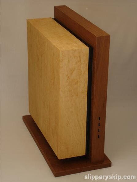 The Level Twelve mod is a performance-upgraded Lenovo H320 micro tower-style computer embedded within a stylish wooden enclosure. The enclosure — made from Birdseye maple and teak and featuring chrome accents — is equipped with additional fans and supplemental vent ducting. It also features four front-mounted USB 3.0 ports via an internal USB 3.0 hub. The underlying H320 chassis is heavily modified for additional cooling capacity and is fully self-contained. The chassis can be withdrawn from the back of its wooden enclosure even while it is operating.