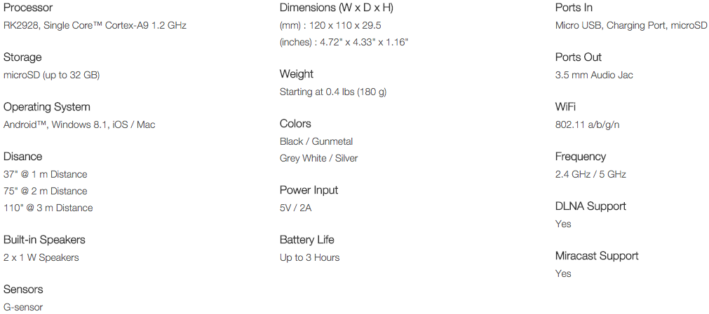 The other half has a cross-shaped control button on the top with a selection button in the middle and a back button to the side. The projector's various ports, minus the microSD slot, is located on the rear of this half — the micro USB port for powering the projector, the power button itself, and a 3.5mm audio jack. Finally, there are three small rubber feet on the underside along the front edge compensating for the device's slight taper. a G-sensor, up to 3 hours of battery life, a pair of 1W speakers, and a weight of 0.4lbs.