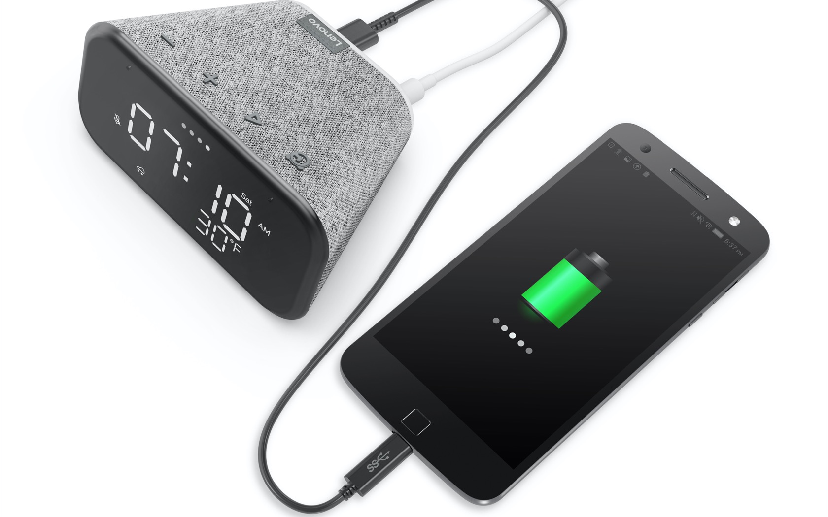 Inside, there's a 3W speaker and two passive radiators. There's also Bluetooth, so that you can pair up your phone and use the Smart Clock Essential as a speaker. A USB-A port, meanwhile, delivers power to charge up that phone.