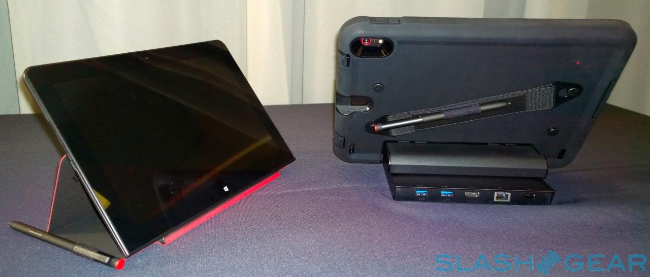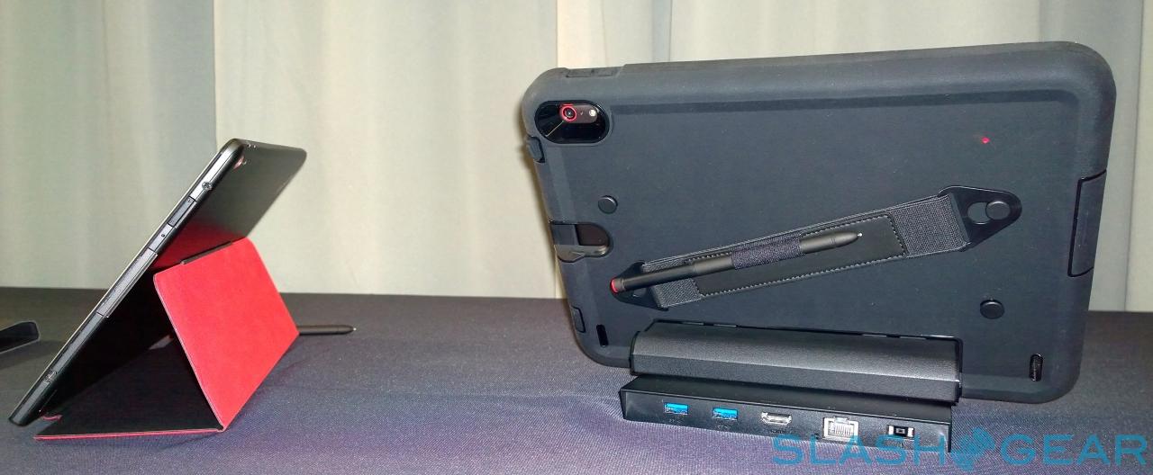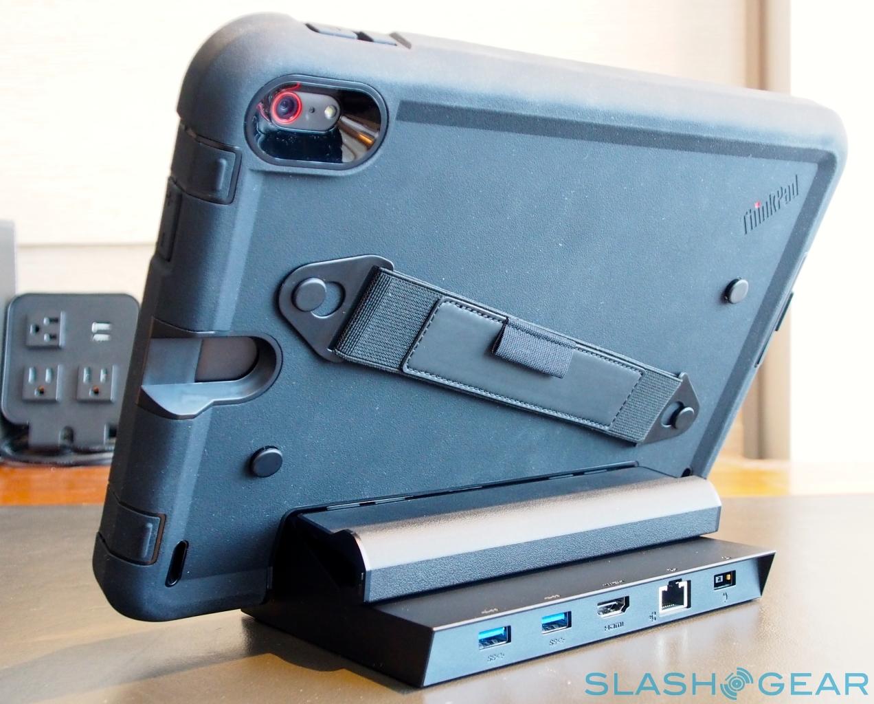 A large hatch in the back of the case will allow it to still be used with Lenovo's Tablet Dock without needing to be removed first, a desktop cradle with ethernet, USB, and display connectivity, in addition to a silo for the stylus.