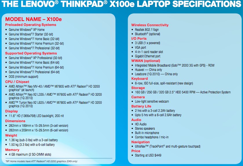 Professional-Grade Features – Equipped with choices of AMD Athlon Neo single and dual core processors and Turion dual core processors1, the X100e provides strong performance needed for multitasking and running typical office applications. It also has the performance needed to support corporate operating systems like Microsoft Windows 7 Professional. The X100e comes with Lenovo's ThinkVantage Technologies, hardware- software tools that help customers deploy, manage and maintain their PCs. The laptop features global availability and technical support along with a variety of warranty options. Exceptional Usability and Design – Lenovo designed the small and compact X100e to be incredibly comfortable to use. An 11.6 inch high definition display provides ample screen real estate, and an ISO full-size keyboard with a multitouch touchpad and Trackpoint make navigation easy. The new contemporary keyboard design features enlarged keys, removal of rarely used keys like System Request and the embedded number pad. The X100e also brings color to ThinkPad with a new choice of heatwave red in addition to midnight black models.