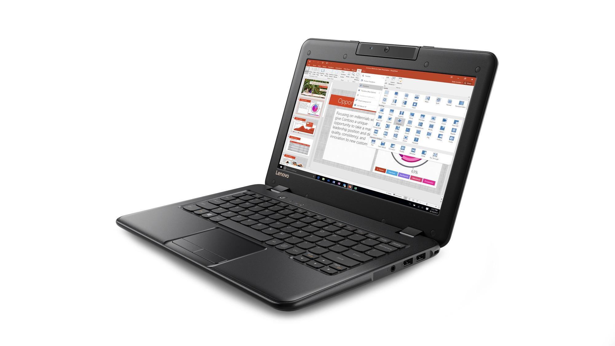 The Lenovo 100e is the most affordable of the line-up. It'll be offered in both Windows 10 or Chrome OS forms, each priced from $219. Running an Intel Celeron N3350 processor, it has an 11.6-inch HD display with an anti-glare coating, and tip the scales at 2.7 pounds. Lenovo claims they'll run for up to 10 hours on a single charge, and will go on sale in January for the Windows 10 model, and March for the Chrome OS version.