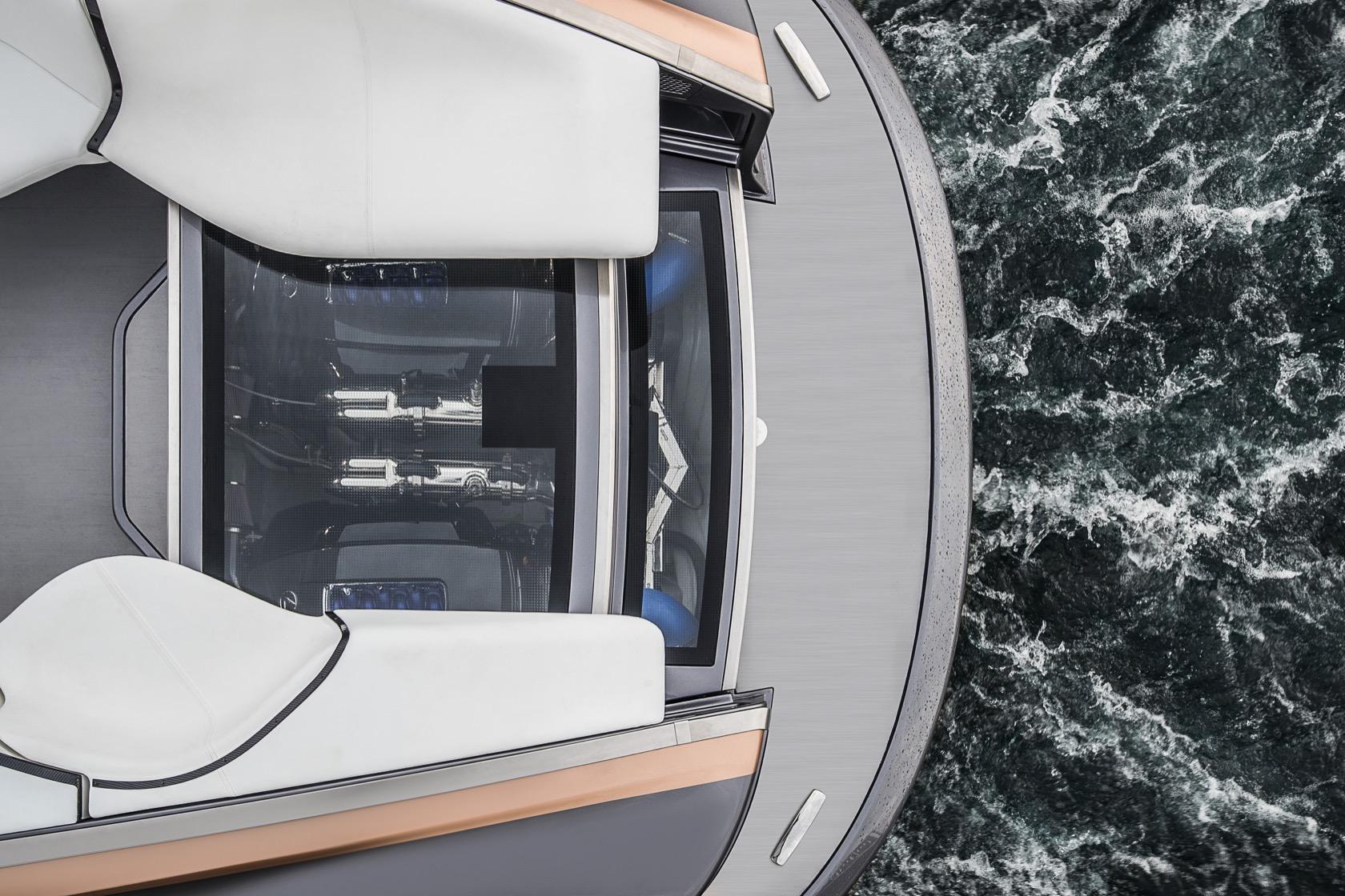 That was good for up to 43 knots, or 49 miles per hour, from its total 885 horsepower. On top of that, it applied the expected wood and leather, then installed a new multimedia system complete with a touchscreen built into the steering wheel. Total capacity is eight passengers.