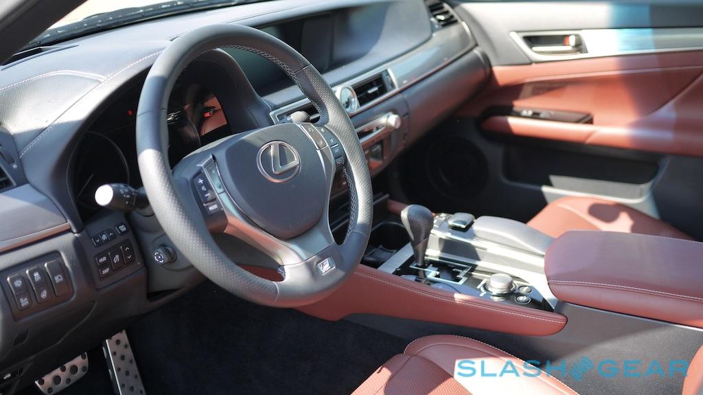 Inside, meanwhile, the GS450h F SPORT cabin wisely bypasses Lexus' tendency toward pale wood, option instead for – in the case of our test car – red leather sports seats, aluminum inserts in the dash and door trim, and perforated black leather on the wheel and shifter knob. The F SPORT logo makes another appearance on the scuff-plates front and rear, and there are pleasingly snicky little paddles behind the wheel for when you don't want to let the CVT gearbox do its thing automatically.