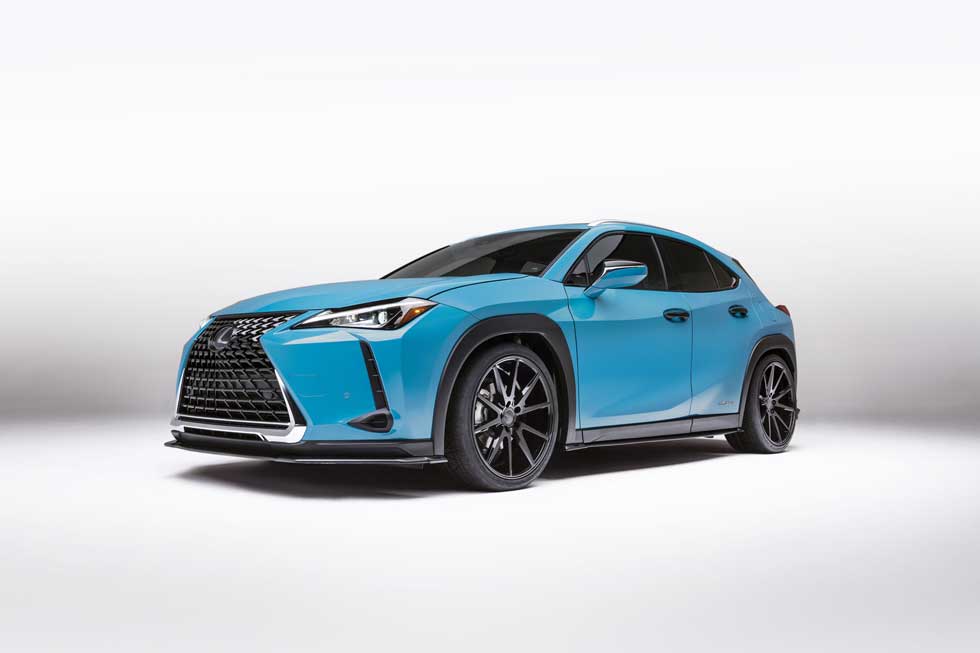 The Lexus UX 250h at the event is a compact crossover and this version was built by Clark Ishihara of VIP Auto Salon. On the outside, the ride is covered in an Oracal vehicle wrap with a custom roof rack for holding a special bike. That bike is the Lexus F SPORT Carbon Fiber Road Bicycle.