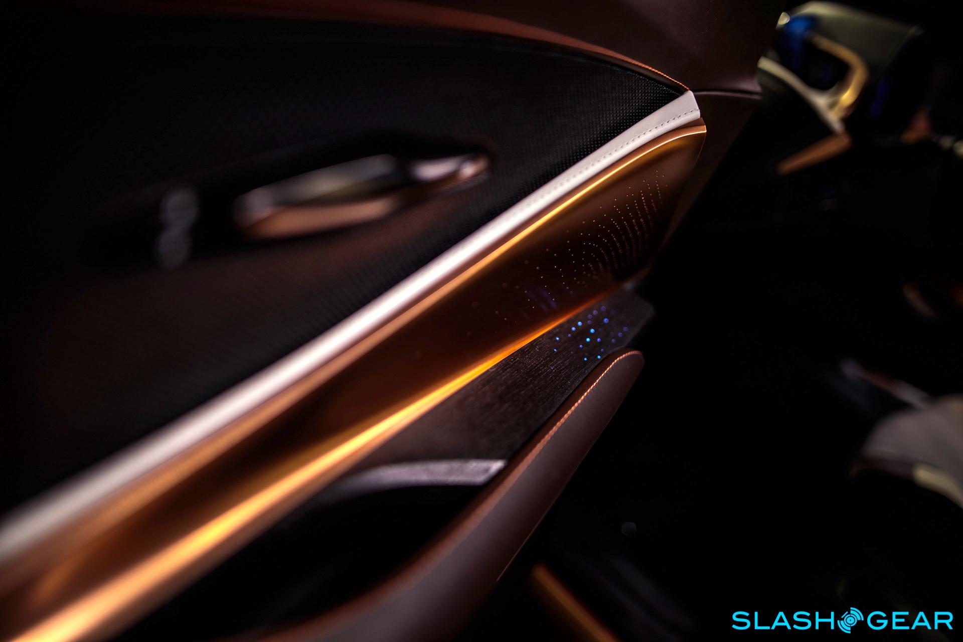 In contrast, the front passenger space has been left more open, with the dashboard unobstructed. In the back, Lexus has used the same seats from the front, and given each passenger their own display screen for infotainment and climate control. All the way through, there are tiny perforations in the wood trim through which LED light glows.