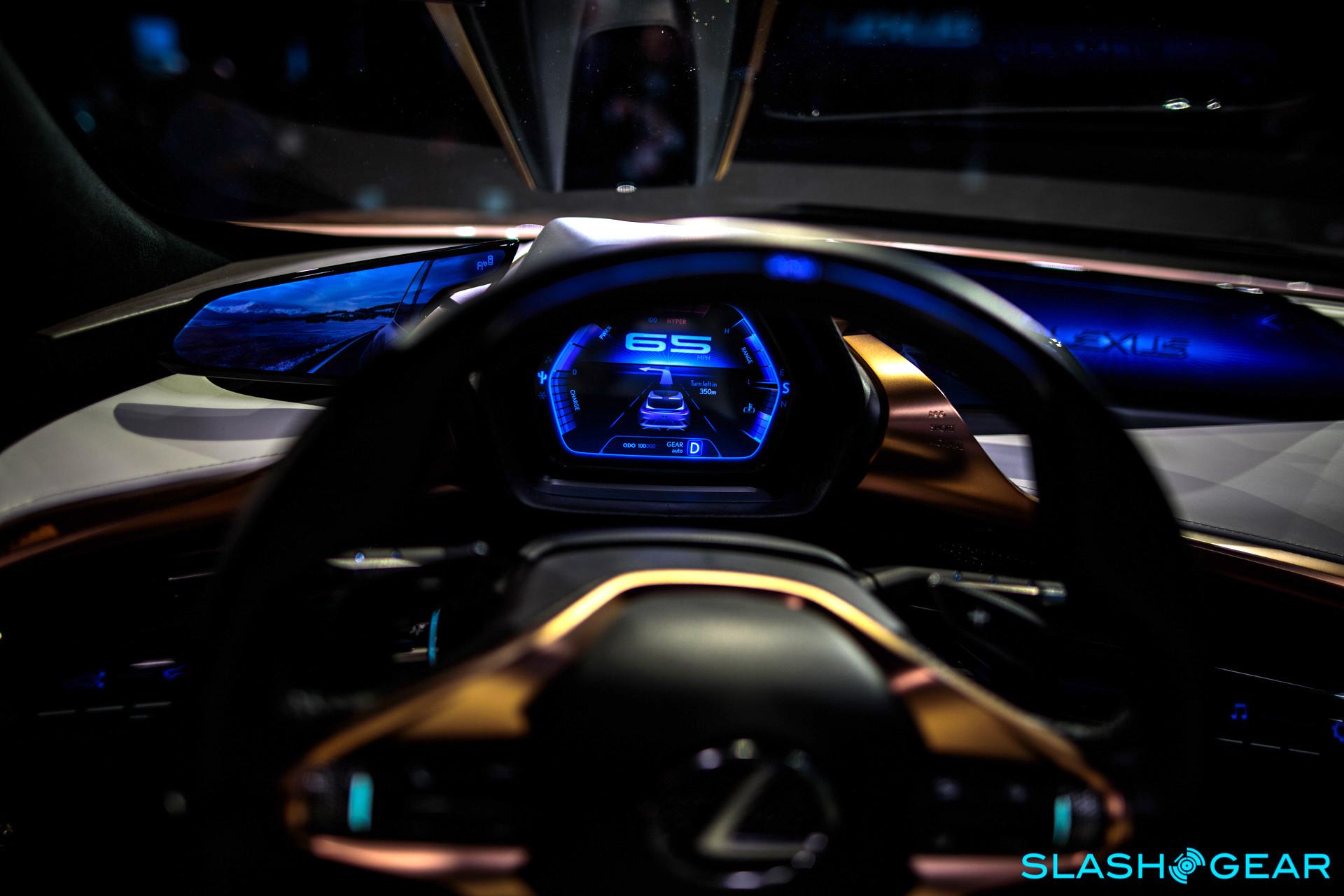 Lexus sees the LF-1 as an ideal candidate for autonomous or at least semi-autonomous driving, and so there's a Chauffeur mode. That relies on the by-wire steering, braking, acceleration, lights, and signals, to take over the day to day piloting and leave the person behind the wheel as more of a supervisor. If, however, you want to take over yourself, all of the powertrain controls have been mounted on the steering wheel. That includes both paddle-shifters and the transmission mode buttons; there are also haptic touch controls for operating the infotainment system.