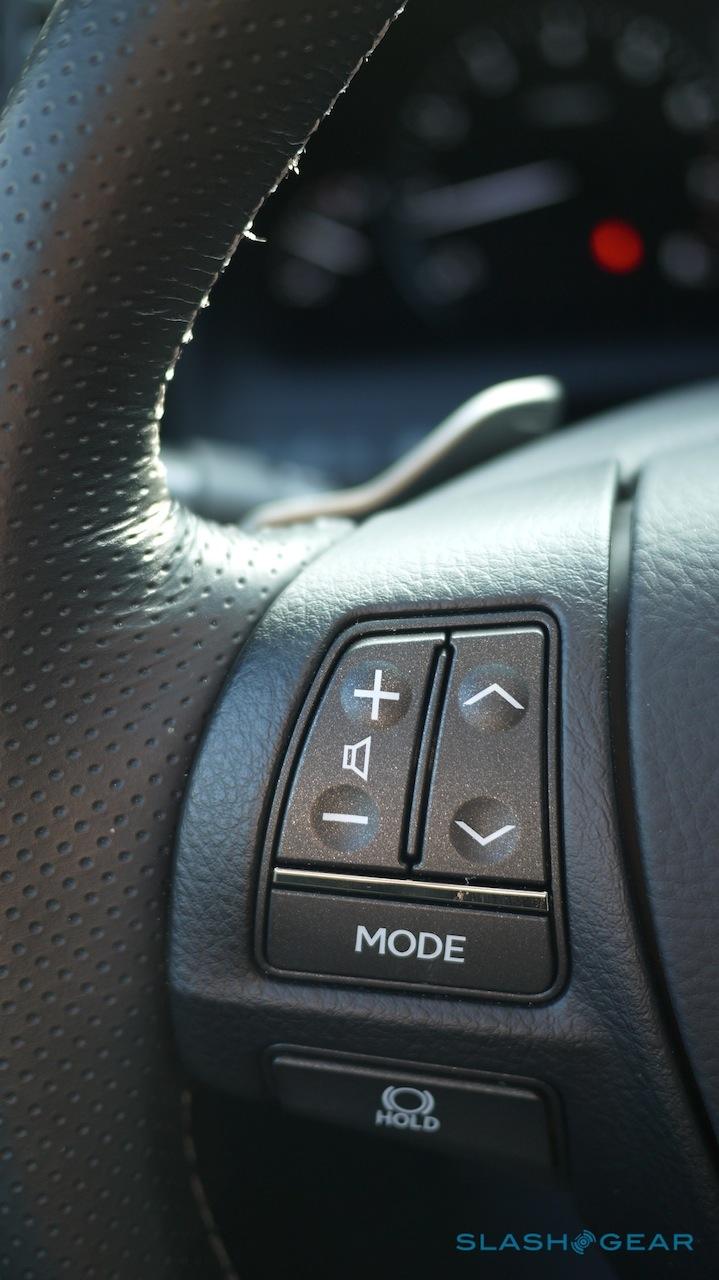 The audio system and standard dual-zone HVAC get physical buttons, but control is predominantly through Lexus' joystick in the center console. It takes a little getting used to: it notches across and is only partially center-sprung, pressing down to select, with two shortcut buttons for the main menu and the map screen just above it. A touchscreen would be a whole lot easier. Once you're familiar, though, the huge expanse of display makes using the system generally a joy: by default, the 2D map takes up the left two-thirds while the remainder is put aside for audio, HVAC, or other settings. Shortcuts on the wheel trigger voice commands and the hands-free phone functionality.