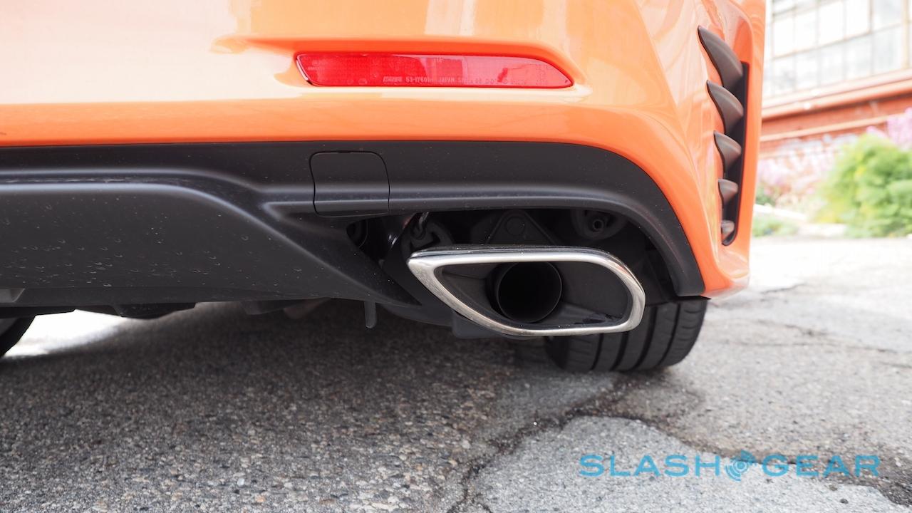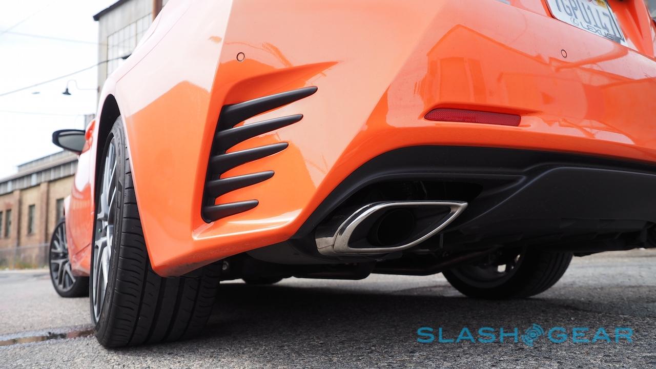 At the rear, the influence of Lexus' LFA supercar is perhaps most evident. Narrow at the trunk lid with its small kick of an integrated spoiler, then broadening down to the wide rear bumper and its distinctive strakes and gills, it's meaty and solid. The big chromed tail pipes help push the corners out visually, giving it a solid stance.