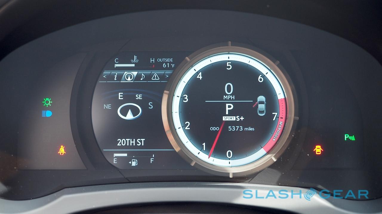 The biggest party trick, however, is the F SPORT's sliding tachometer. Normally, the digital instrumentation in the driver's binnacle is dominated by a central circular screen, putting engine speed around the edge while speed, gear, and driving mode are in the center.