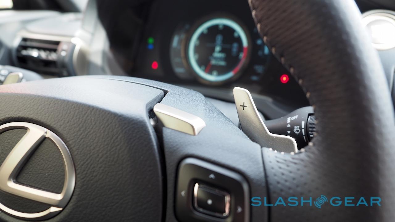 Driver ergonomics are good, too. The chunky-rimmed wheel pulls out close – motorized on the F SPORT – and the paddle shifters fall neatly under your fingertips. Lexus' aluminum-covered pedals are accompanied by a useful rest for your left foot (there's no manual option), while the leather arm rest in the center console is well placed for your elbow.
