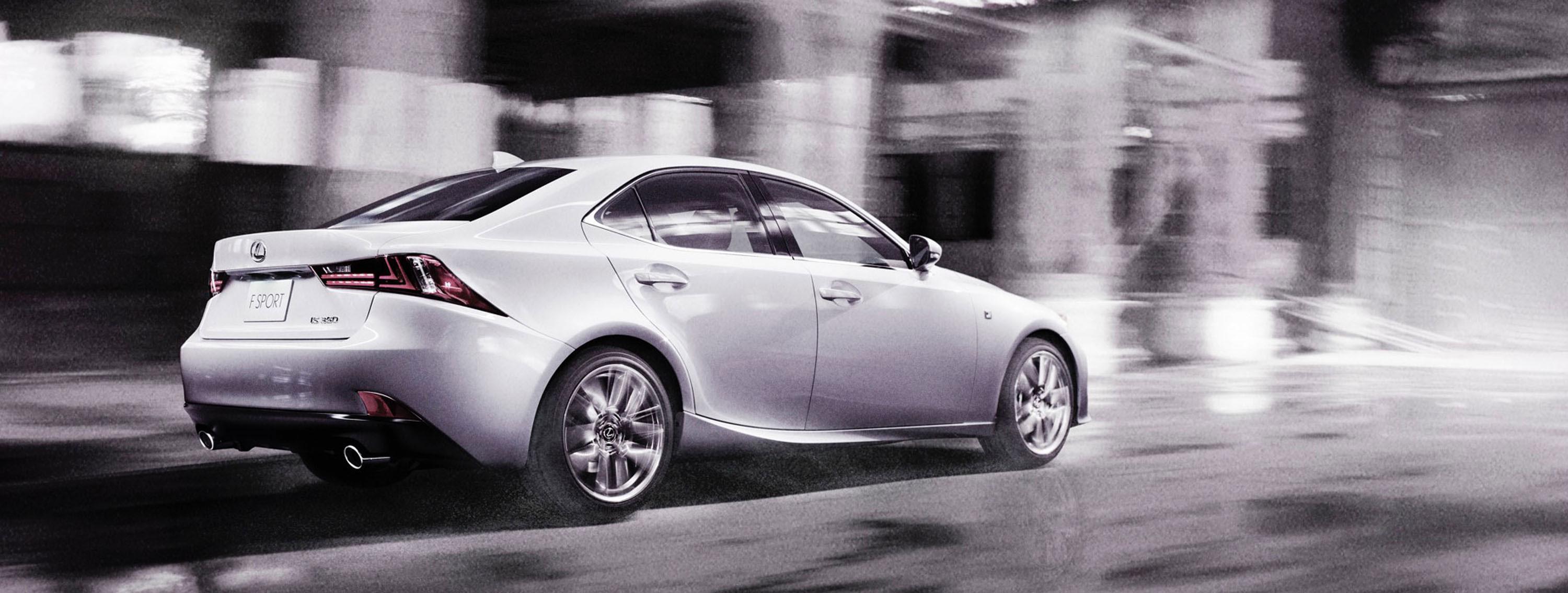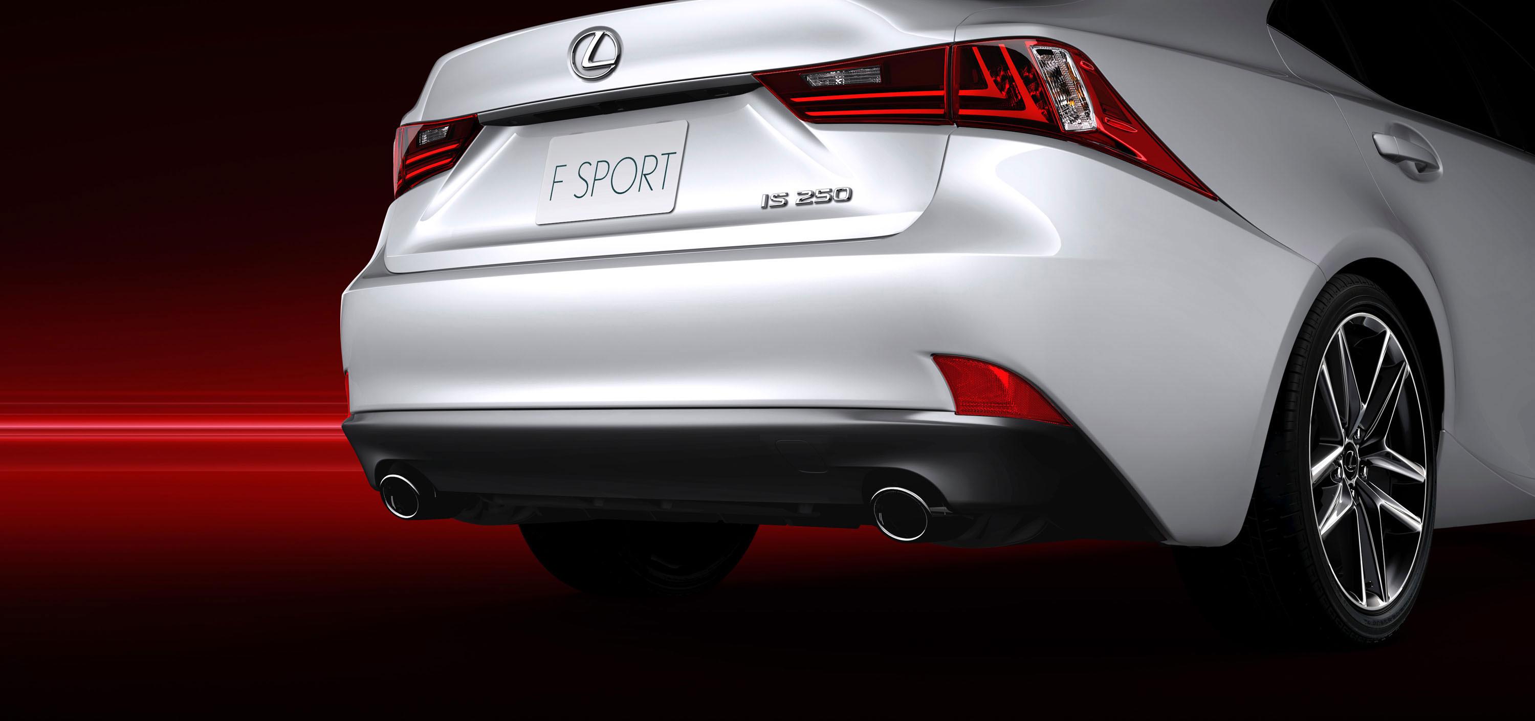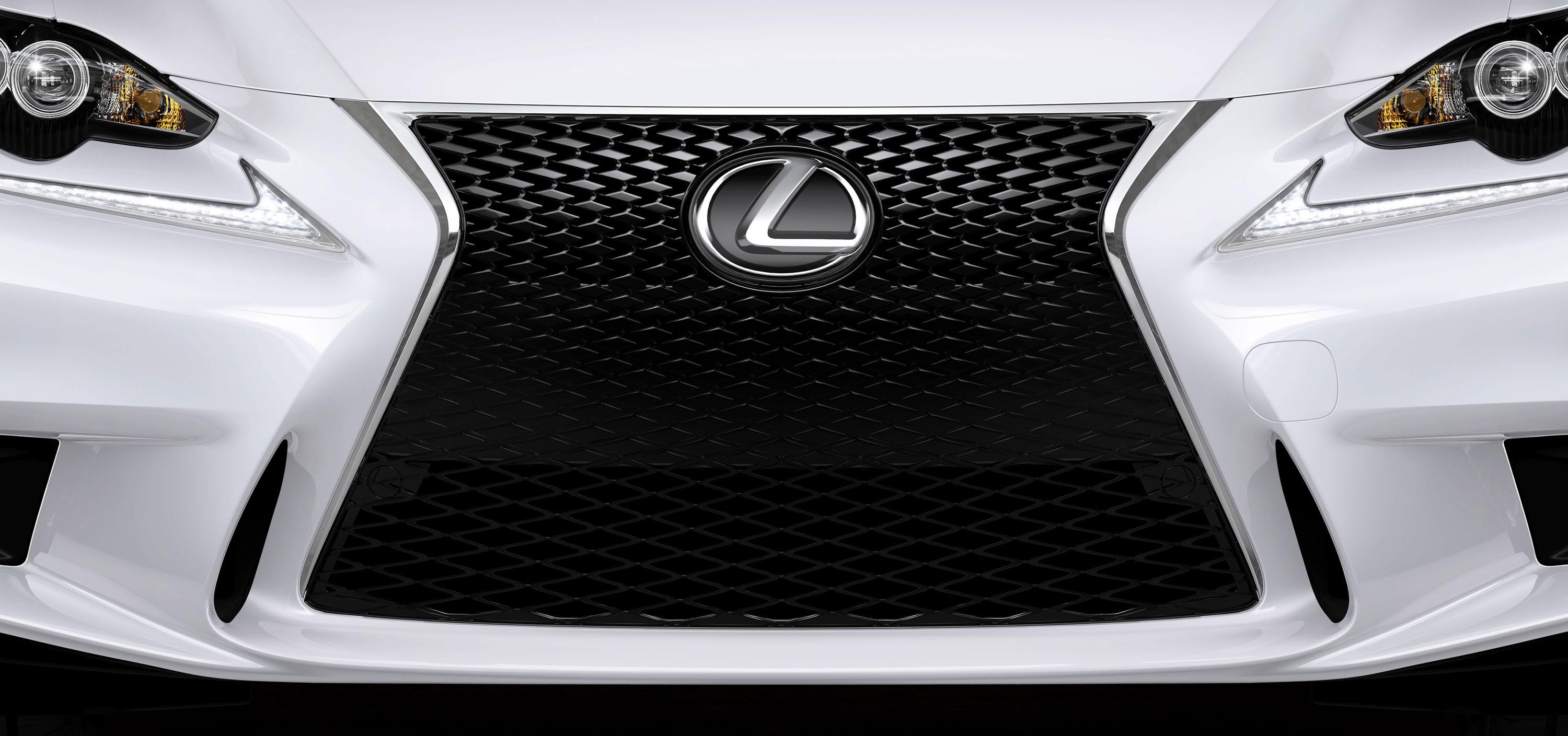 The IS 350 F SPORT model takes that grille one step further, with a higher waistline that maximizes potential air-intake. Both regular and F SPORT models have a rising beltline and chunky rear three-quarters – Lexus says that's to emphasize the large rear wheels – while L-shaped daytime running lamps get their own place on the front lighting cluster.