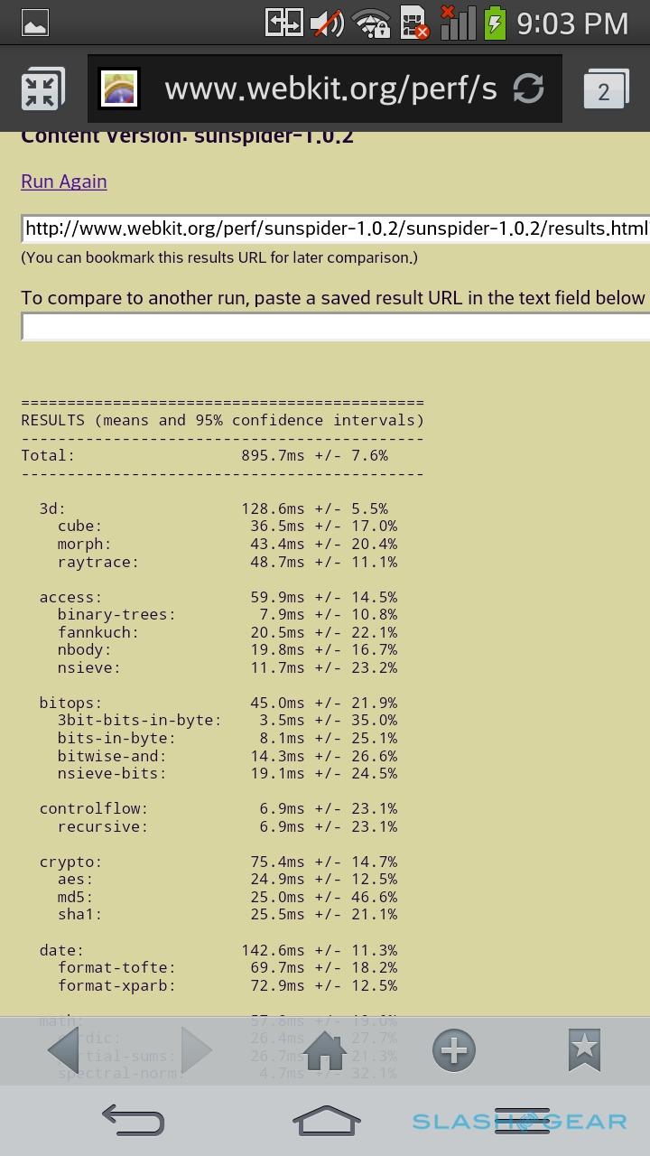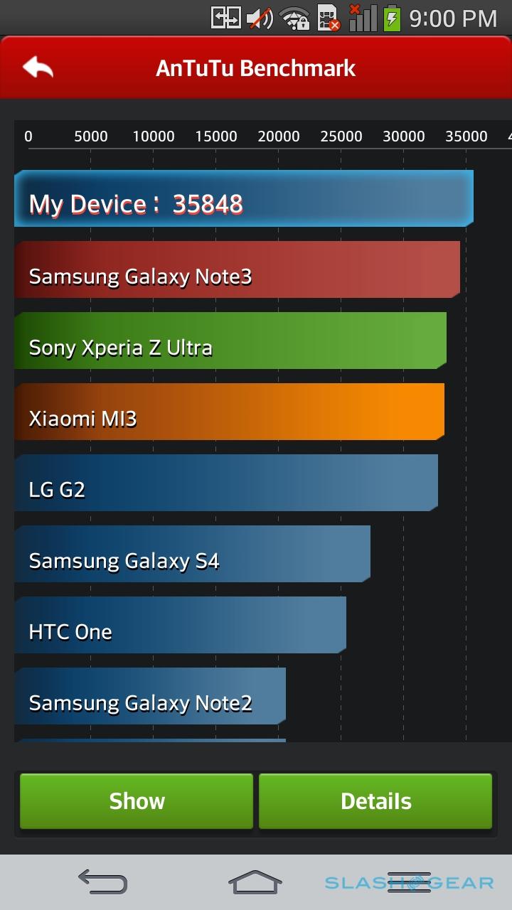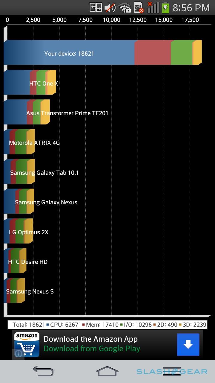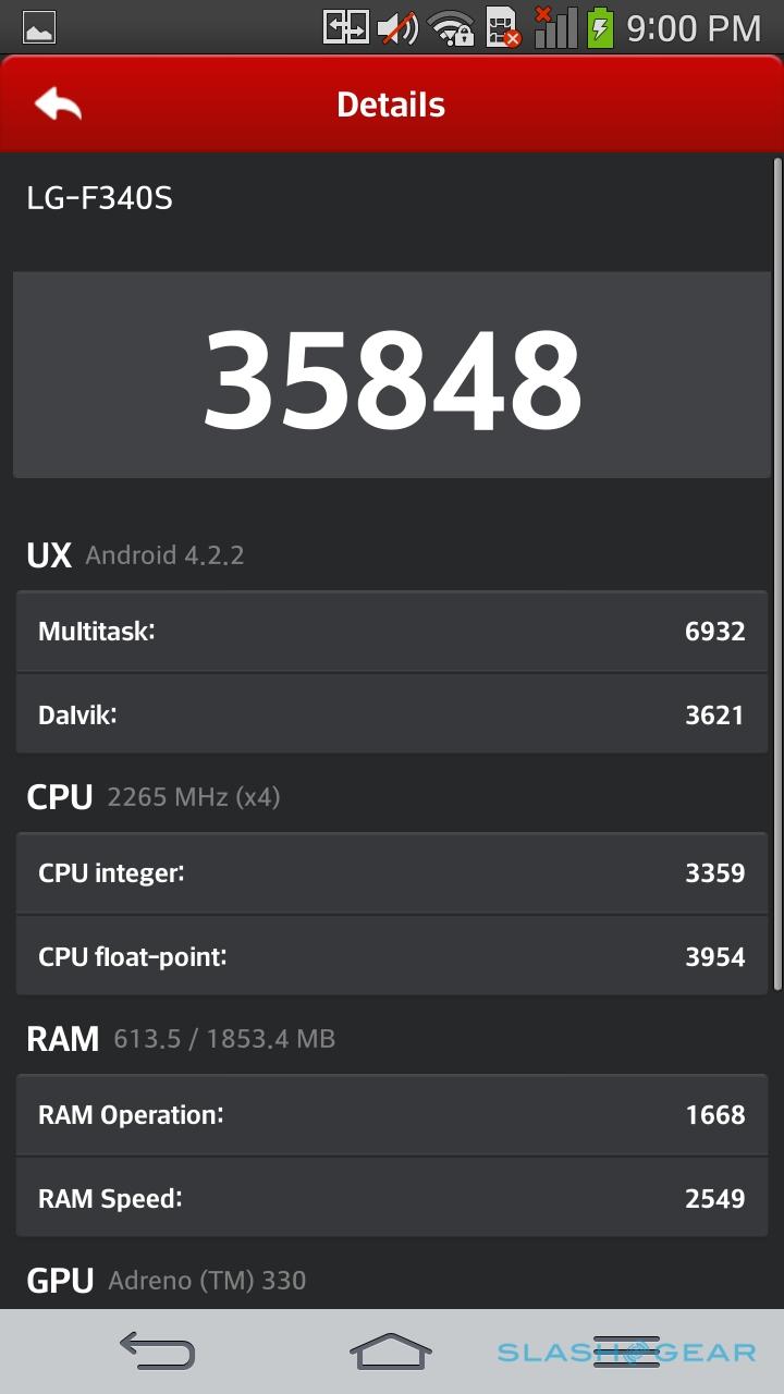Smartphone benchmarks are a contentious topic these days, though if you're of a mind to judge a device by how it ranks, the G Flex shouldn't disappoint. In Quadrant, the phone scored a hefty 18,621, the Snapdragon 800 quadcore again demonstrating its mettle, while in AnTuTu it came in at 35,848. Still, the 895.7ms SunSpider result (where faster is better) is an outlier in the grand scheme of things, the LG taking roughly twice as long to finish as Apple's iPhone 5s. Nonetheless, in day-to-day use, the G Flex simply flies, giving us no issues with jumping between apps, HD playback, and even split-screen multitasking.