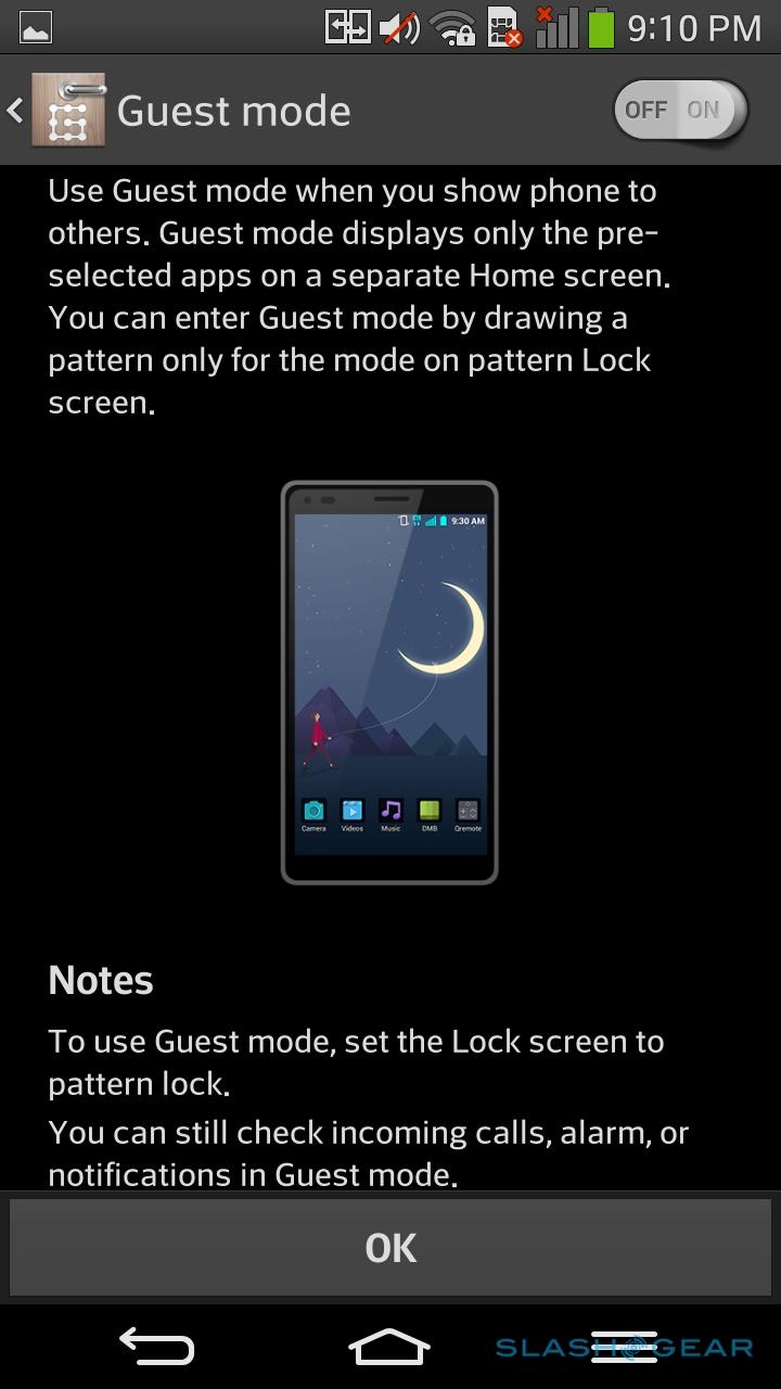 The tweaks don't end there, either. There's Guest Mode, which allows a second lockscreen PIN or pattern to be set up, accessing a limited account which can be only permitted to open certain approved apps. Slide Aside uses a three-finger swipe to multitask, while Plug & Pop triggers certain apps when accessories are plugged in, like Spotify when you jack in your headphones. Quick Remote, meanwhile, turns the G Flex into a universal remote control; somewhat unusually, the IR blaster is on the rear of the phone, to the left of the camera, rather than on the top edge, so you have to hold it out flat toward whatever you're controlling rather than point as you might a regular remote.