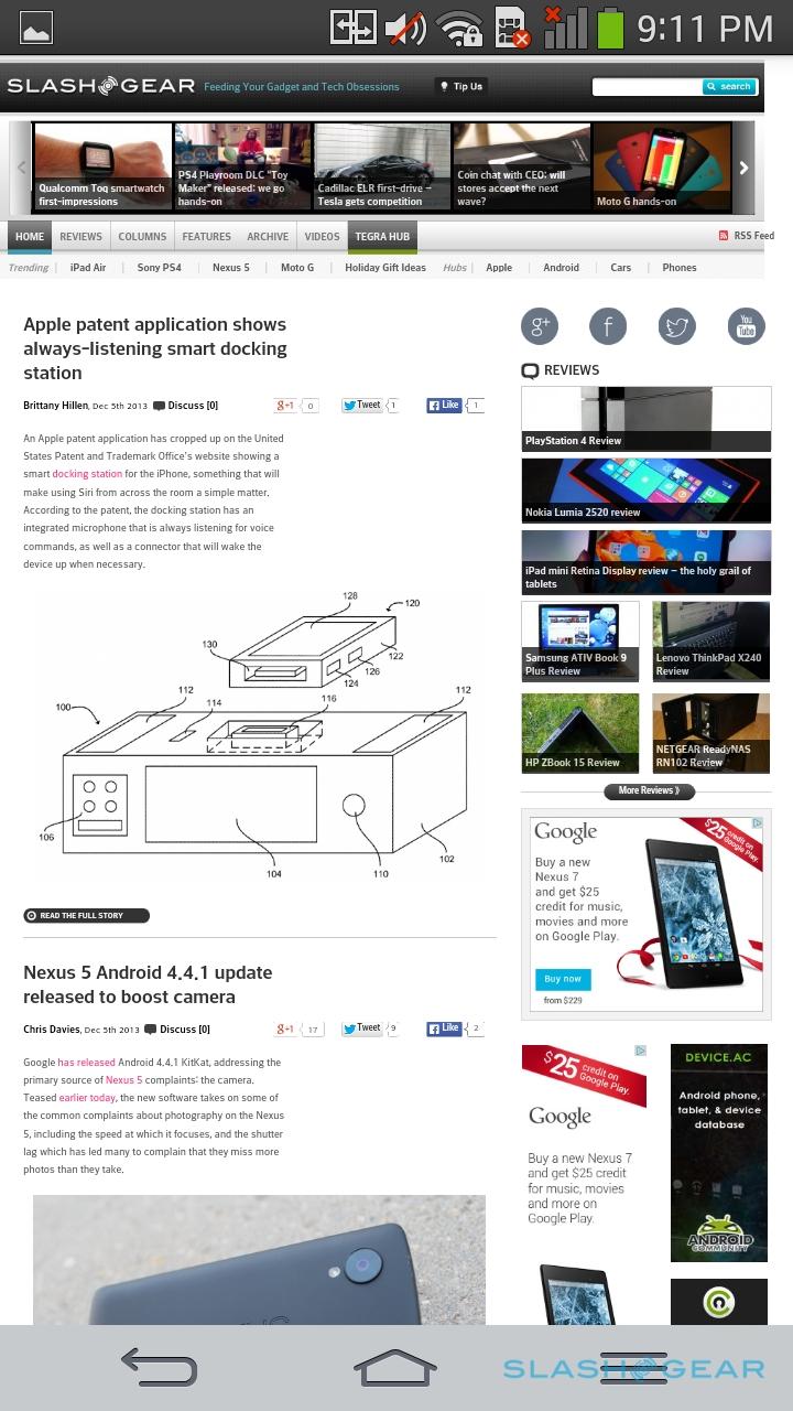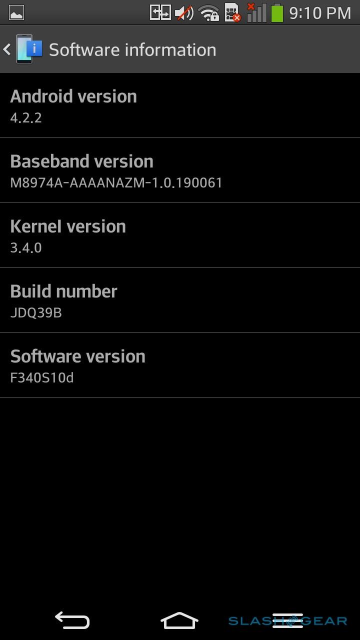 Inside, there's Qualcomm's Snapdragon 800 MSM8974 2.26GHz quadcore, paired with Adreno 330 graphics, and 2GB of memory. Internal storage is 32GB – our unit had just short of 24GB available out of the box – and like on the LG-made Nexus 5, there's no microSD slot to expand that.