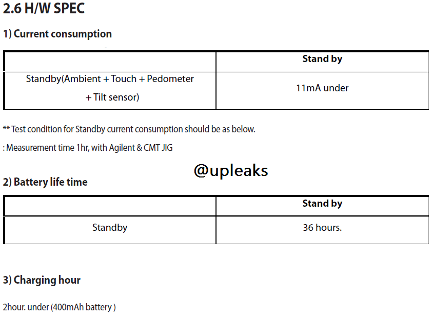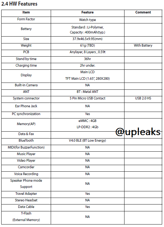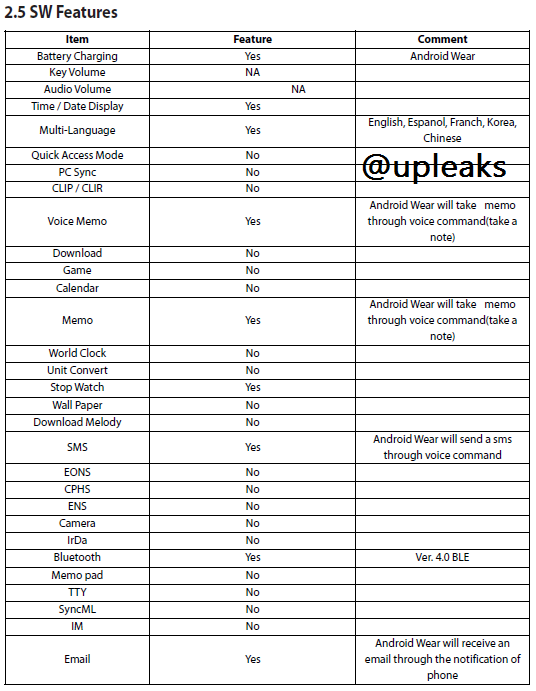 Features seem to be quite sparse on this device, even fewer than what Samsung's Tizen-powered counterpart is offering. For example, the device has no calendar or music playing capabilities, something which Samsung has added in its latest generation of wearables. Much of the functionality, however, like replying to SMS, being notified of emails, or even making memos, are noted to come via Android Wear, leaving the door open for additional functionality via the platform. There are no noted biometric sensors here either, with the sensor set limited to proximity, tilt, gyro, and pedometer. The 400 mAh battery sounds quite capable, though, and is promised to last 36 hours on standby. Sadly, it seems that there will be no camera on this device, at least based on this leak.