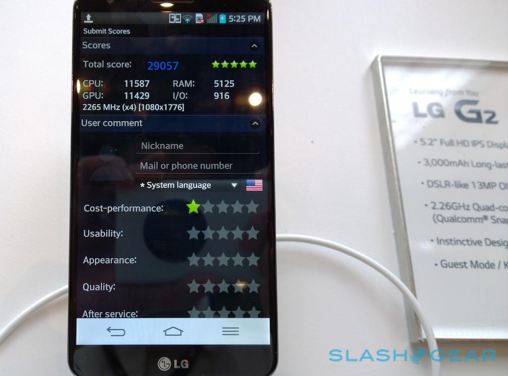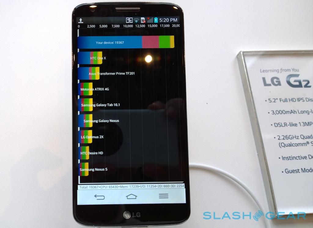 Update: We had the opportunity to run some preliminary benchmarks on the G2. Now, it's important to remember that this is unfinalized software and hardware, so don't draw too many conclusions from the numbers beyond "this is a fast phone". We'll have more solid impressions to share in our full review with a production device.
