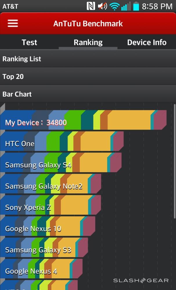 The benchmark known as AnTuTu features a relatively new 1-vs-1 comparison chart with highest results from a variety of devices. Here you'll find the LG G2 taking the HTC One, Samsung Galaxy S 4 (both of them with a Qualcomm Snapdragon 600 quad-core SoC), and a Sony Xperia Z (with a Qualcomm Snapdragon S4 Pro) to lunch.
