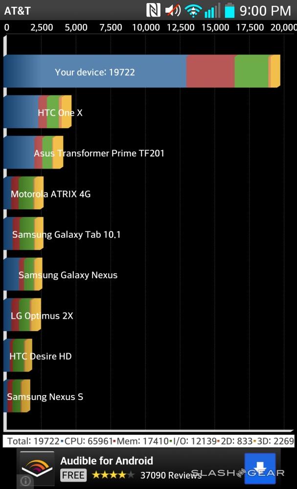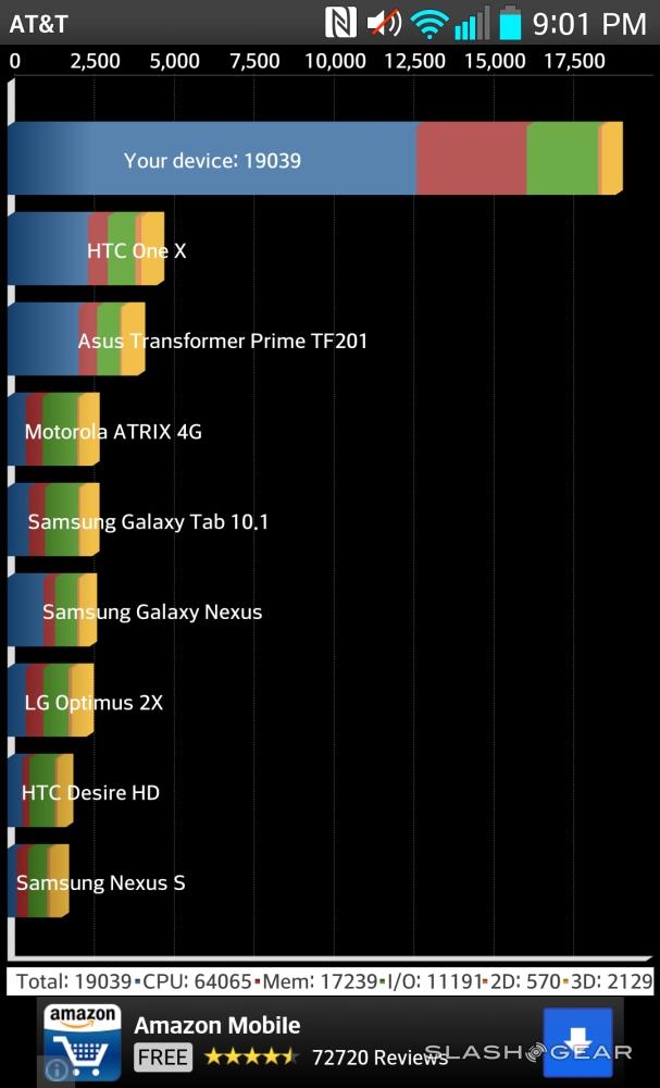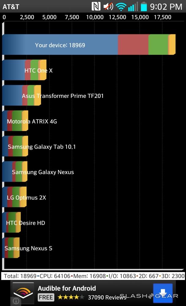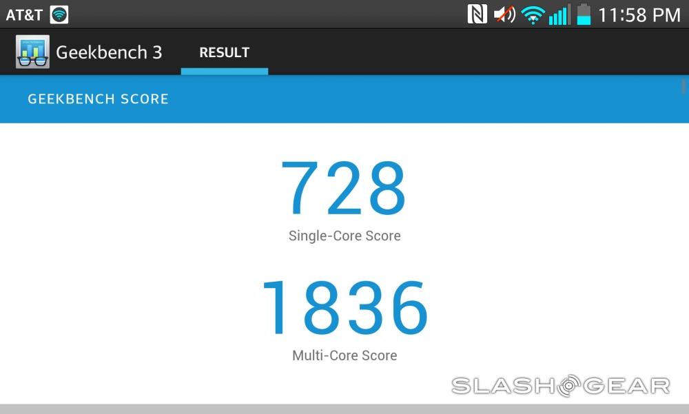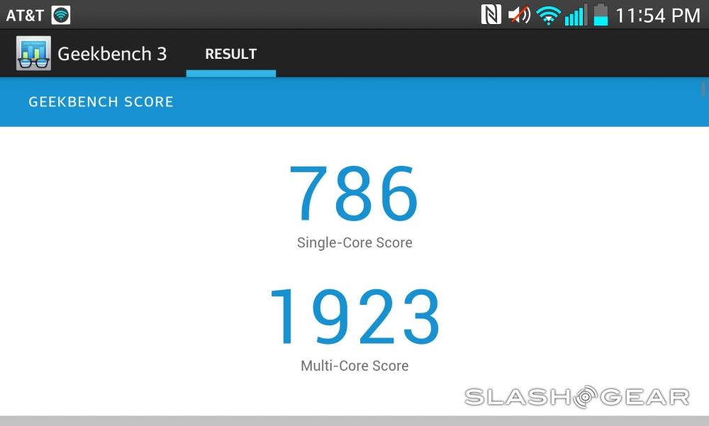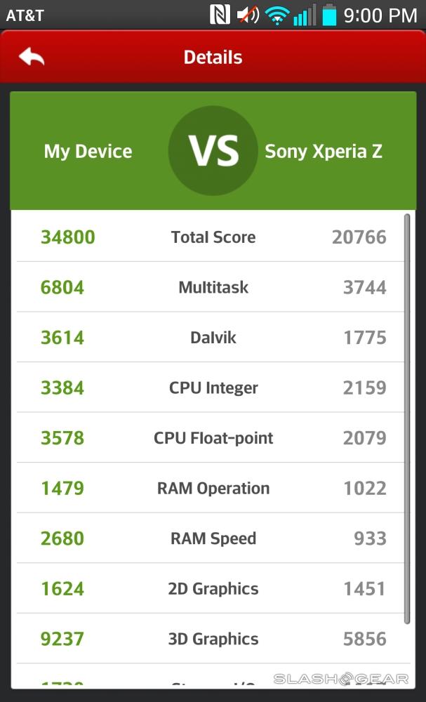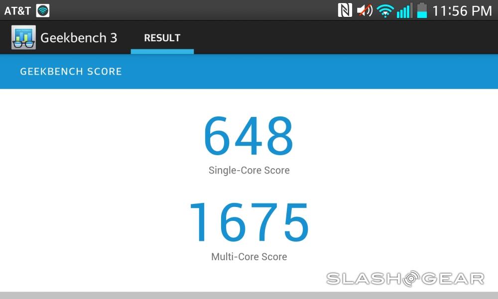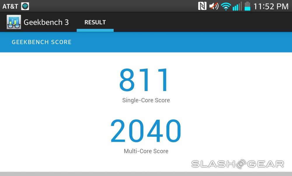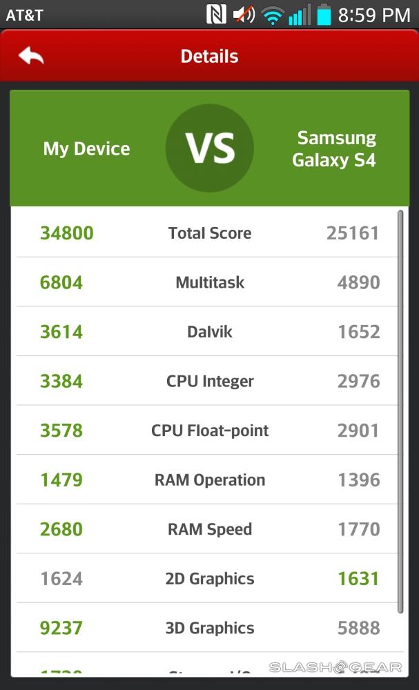 In Quadrant, the LG G2 destroys all but a select few processors on the market today. In one case we knocked out a score of 18969 (total) while a test of NVIDIA SHIELD and its NVIDIA Tegra 4 quad-core processor scored an 18696 (total). It's not entirely fair to compare SHIELD to the LG G2 simply because they've got an entirely different number of pixels to work with (SHIELD sits at 720 x 1280), it's striking how similar these processors are scoring, especially given the massive space between them and the previous generation SoCs.