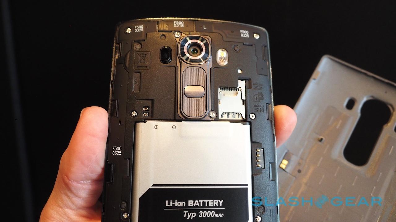 Removable batteries and microSD slots are increasingly rare on high-end smartphones, but LG is a hold-out, offering both on the G4. LG suggests you'll see up to 19.6hrs of 3G talk time, 93.8hrs of music playback or 13.6hrs of video playback, or 10.7hrs of browsing over WiFi. Unclip the back cover – at which point you realize quite how thin the layer of leather actually is – and you can swap out the 3,000 mAh Li-Ion battery for a replacement.