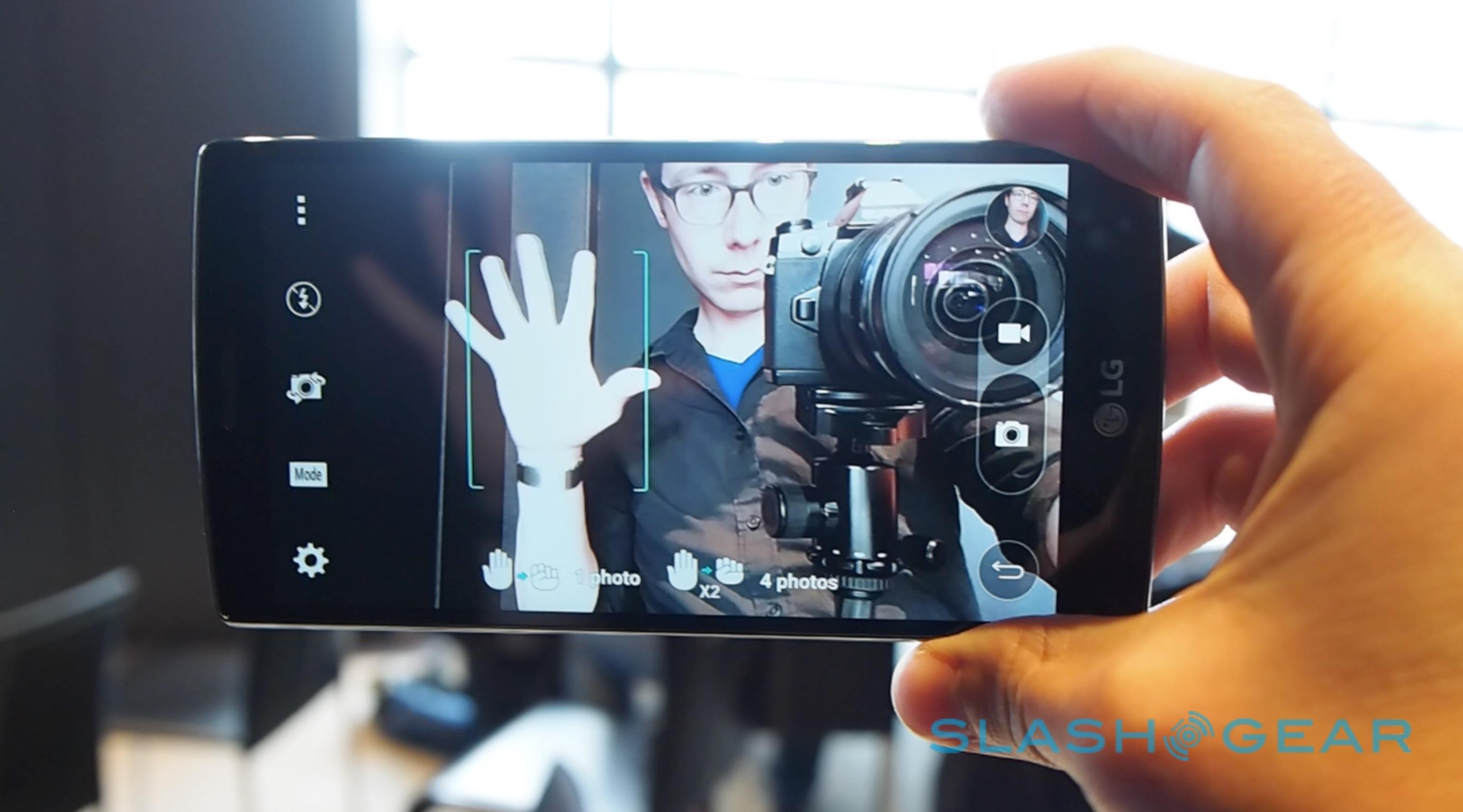 Meanwhile, there are 104-megapixel panoramas, producing whopping 20,288 x 5,120 frames, along with an 8-megapixel front-facing camera. LG's Gesture Shot – which allows you to trigger a selfie countdown by clenching your fist in-frame – has been improved, too: clench your fist twice, now, and you'll get a series of four shots in 1s intervals.