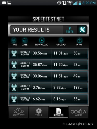 Next have a peek at a few Speed Test scores from right here in New York City, and note that we've found almost exactly the same scores from downtown Brooklyn to JFK Airport back to LaGuardia over the past few weeks with several different Verizon 4G LTE devices. Have a peek at our review of the Motorola DROID RAZR M to see additional speed tests with Verizon in the Twin Cities in Minnesota as well as NYC and stay tuned to see if this LG device has the same results – our guess is that they'll be essentially the same.