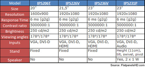 The IPS206T doesn't feature 1080p HD resolution, but the other three do. The latter three also promote a response time of 6ms. Each of the displays feature a dynamic contrast ratio of 5,000,000:1, and a 250cd/m2 brightness. And with the IPS-based displays, you can expect the same 178-degree viewing angle. The three home models are all housed in a black plastic frame, and the stand itself is fixed. However, if you want to swivel, pivot, and tilt your display, than the IPS2321P Pro model will be your choice model. It also features built-in speakers. There isn't any word on pricing or release date, but those details are supposed to break cover soon.