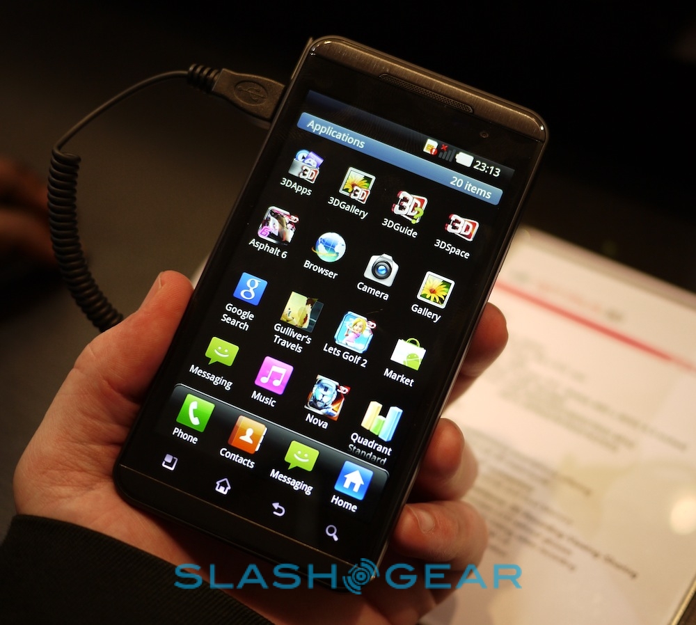 It's the camera which most people will be interested in, a pair of 5-megapixel lenses on the back which can either shoot regular video or 3D footage. Played back on the phone, the parallax barrier display does a solid job of presenting a 3D picture, though unfortunately you can't see it in our video demo. You can also squirt it to a 3D-capable HDTV, either via the HDMI output or wirelessly using DLNA if your set supports it.