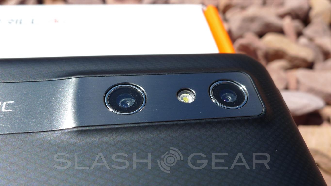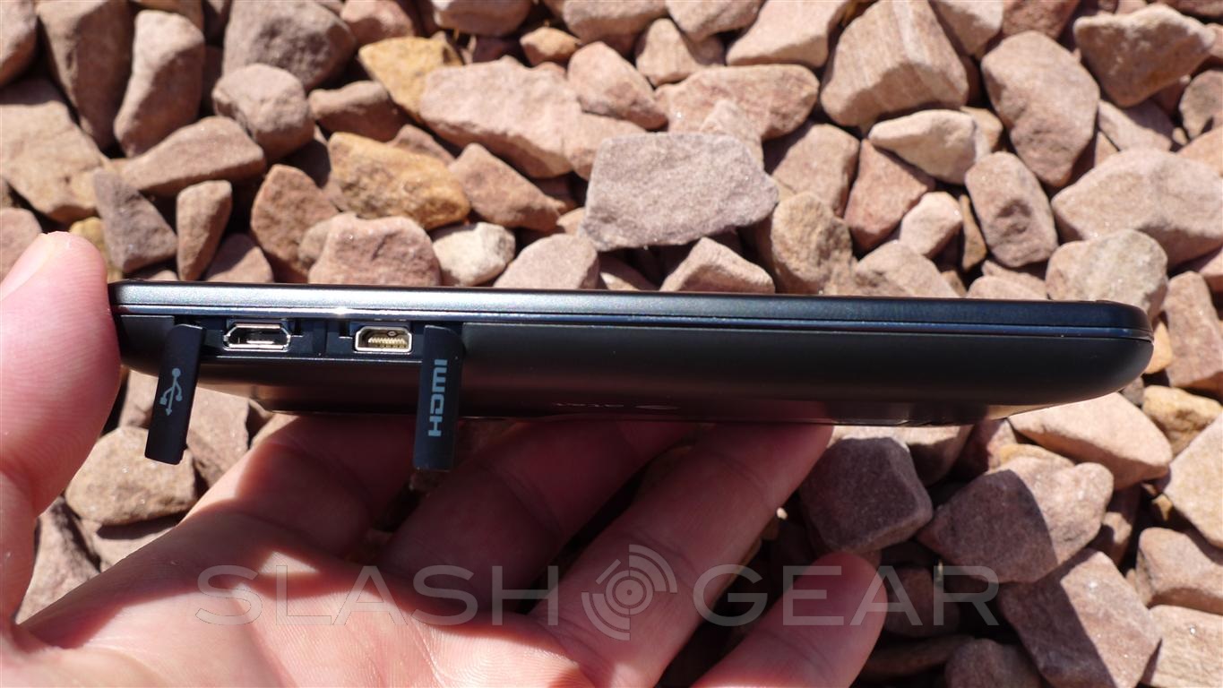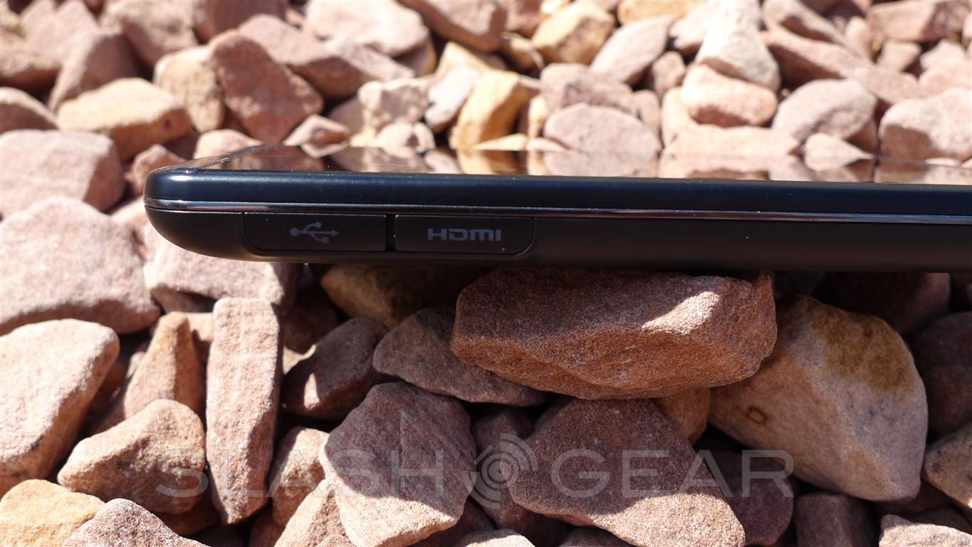 Overall the design is pretty sleek and you could even call it purdy. The rear has those cameras as well as the aluminum strip that matches nicely with recent LG offerings such as the LG G-Slate and G2x. The back cover is a soft touch plastic with a very light and barely noticeable pattern that almost seems like it was carbon fiber inspired, it's a nice touch. Around front is the usual capacitive android buttons as well as that all popular front facing camera for chat. The device features HDMI-Out and they supplied the cable unlike most carriers or OEM's so thank AT&T and LG for that one.