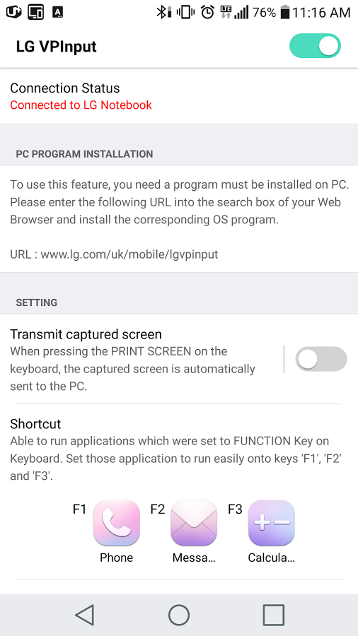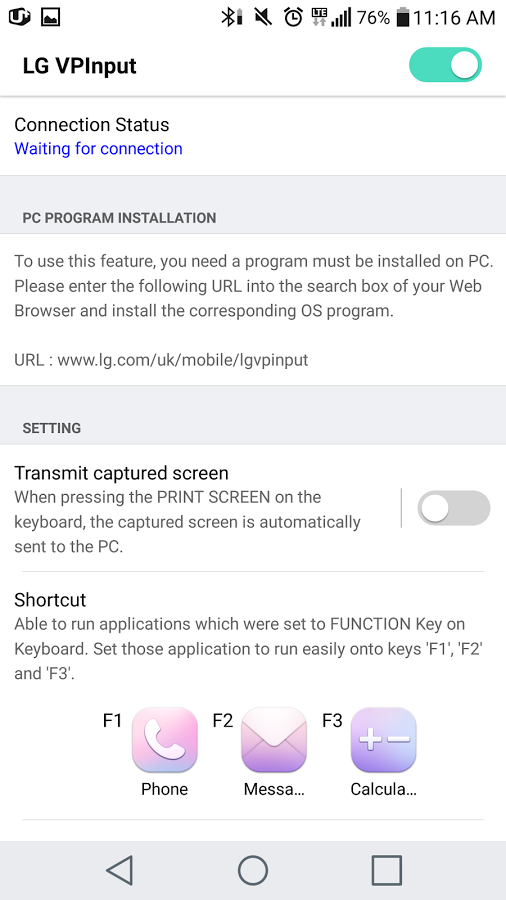 The basic purpose of VPInput is to let users control their LG smartphone from their PCs or Mac, which means mouse clicks translate to touches and keyboard input is relayed to the Android smartphone. It does have a few bonuses that go beyond direct control. Clipboard, for example, is shared between the two, so copying text in one makes it available in the other. You can also take a screenshot of the smartphone and the image gets automatically displayed on the computer. Plus, you can set some of keyboard shortcuts to launch Android apps immediately.