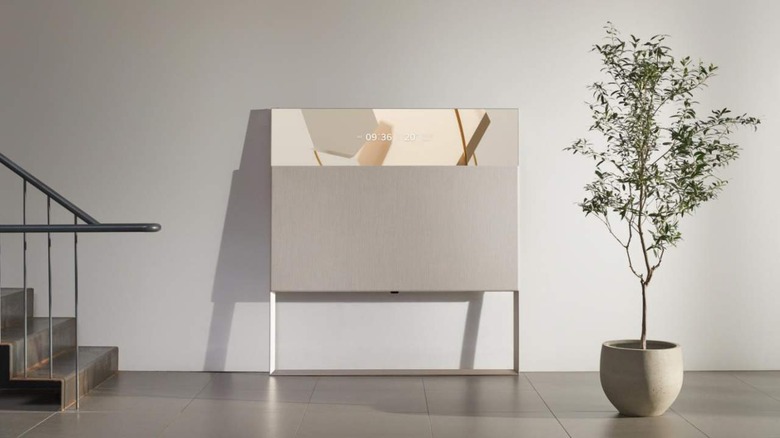 The idea, according to LG, is to mimic an artist's canvas, those cloth-like blank frames that would later hold the artist's visual masterpiece. As if trying to mimic that process of creation, the TV's canvas cover rolls down to reveal the 65-inch OLED screen in all its glory. That cover doesn't completely roll up, however, and leaves a small portion of the TV always visible.