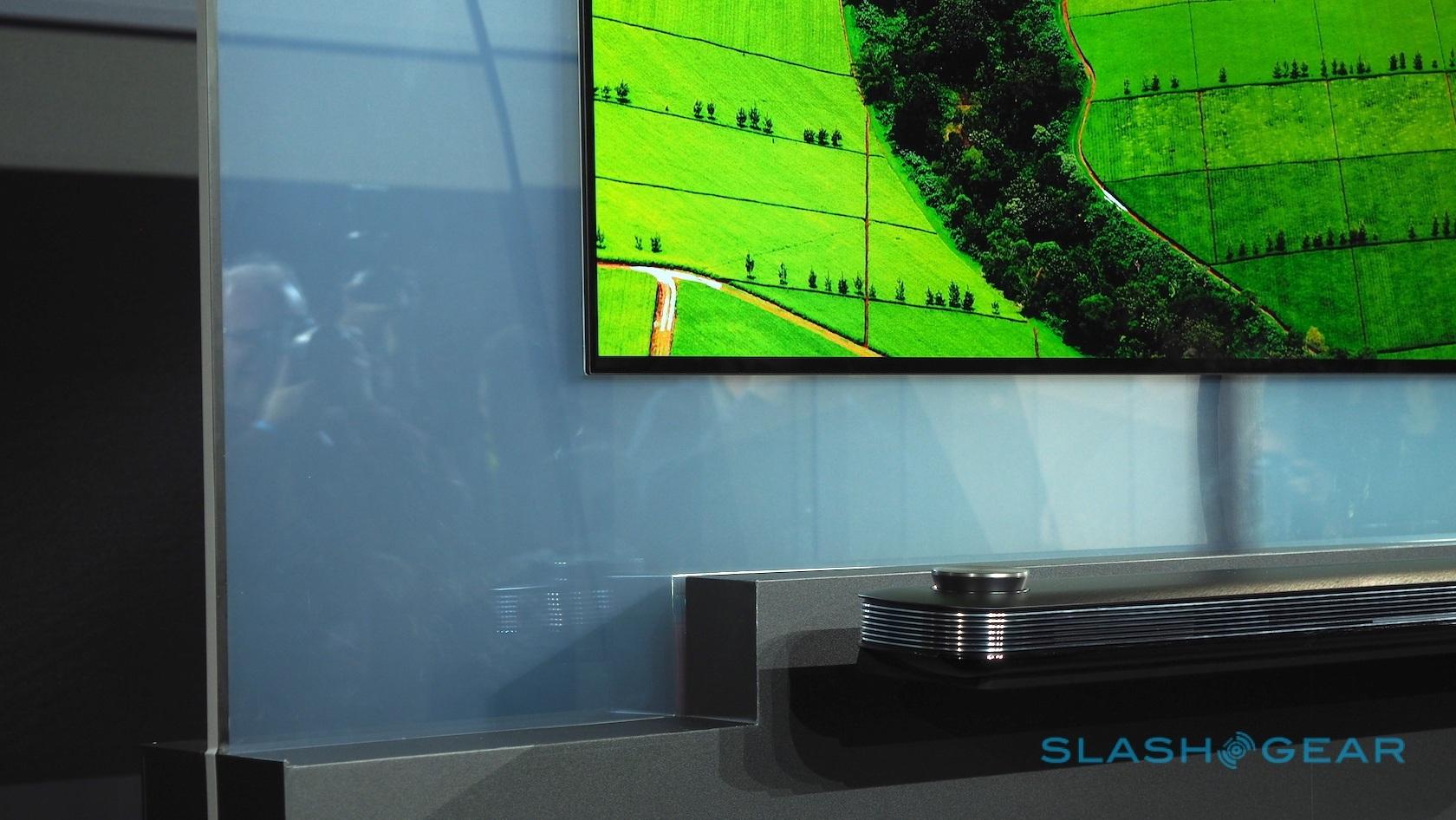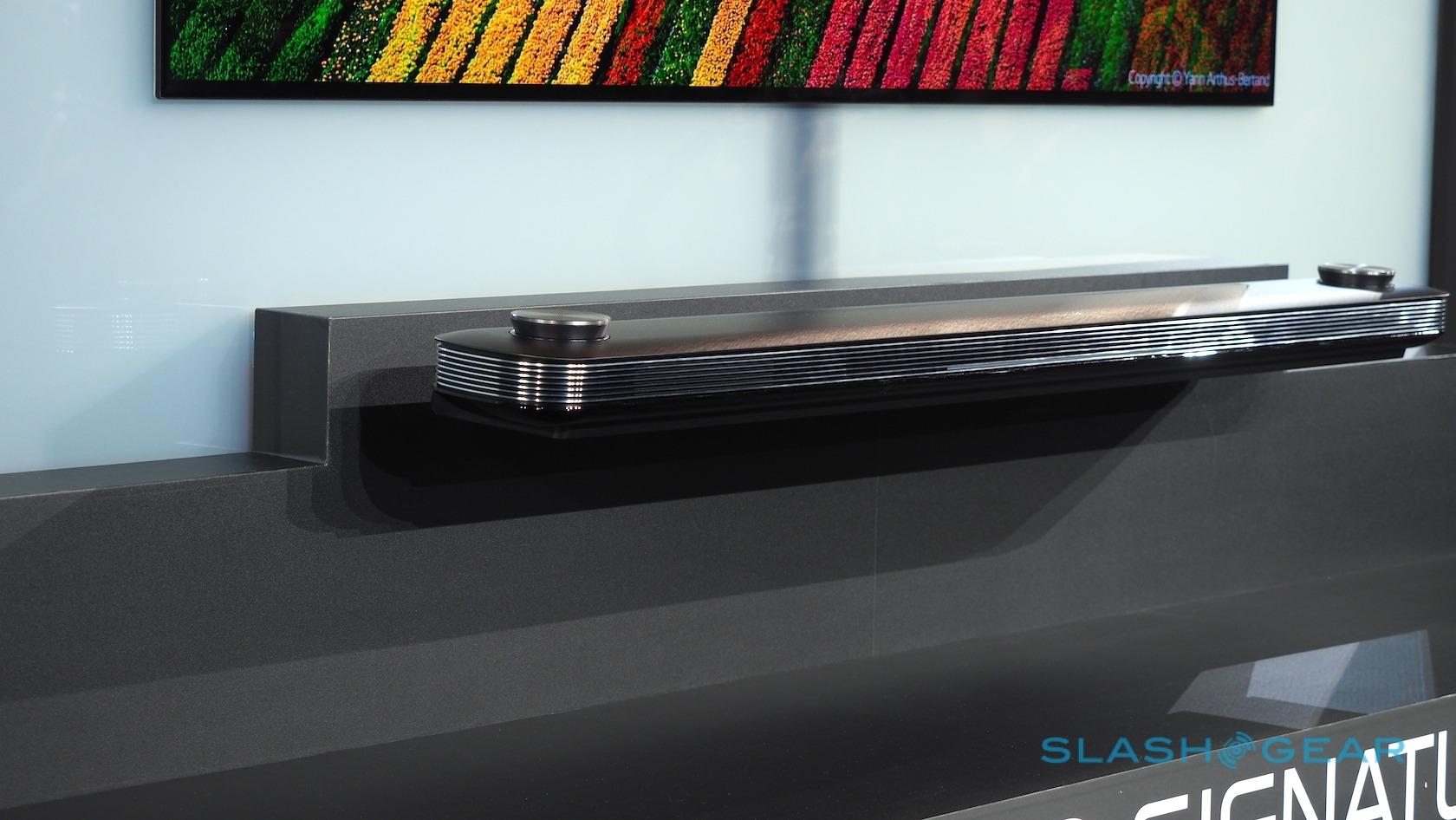 Dolby Atmos support is included, and since there's not really room in the screen itself for speakers, LG has included a separate sound bar. Almost Art Deco in its sculpting, it has up-firing speakers for the overhead surround sound effects Atmos is known for. A new LG Blu-Ray player will have HDR10, Dolby Vision, Dolby Atmos, and Ultra HD 4K support, if you need a way to play your shiny new media.