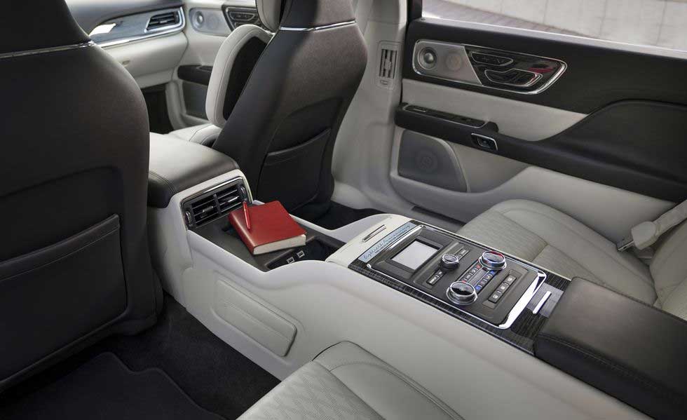 Lincoln figures the car will gain as much as 150 pounds compared to a standard Continental. The center seat in the rear bench is replaced with a big center console. That leaves two large chairs on each side. The center console has tray tables, a tablet holder, and other tidbits.
