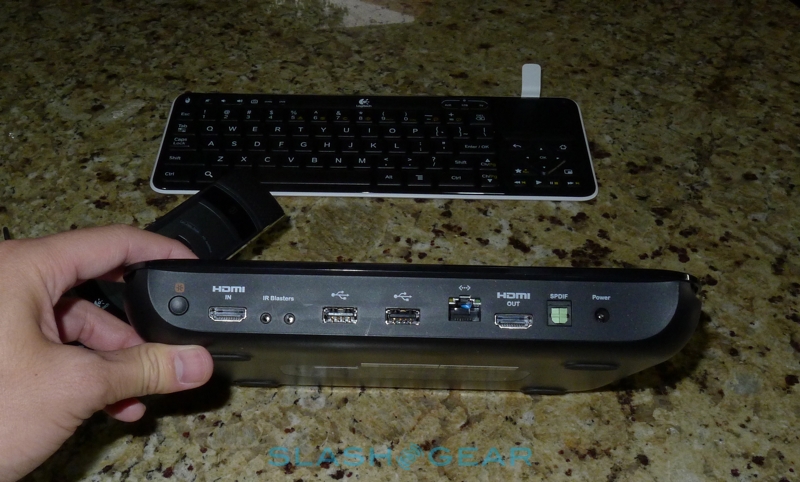 As STBs go, the Revue is relatively inoffensive in its design. A reasonably compact 247 x 171 x 36 mm box, it's finished in matte and gloss black plastic with a couple of indicator LEDs up front but no display or channel indicator, as you might find on a cable or satellite tuner. On the back there's an HDMI input and an HDMI output, two IR blaster ports for using the optional IR wand Logitech includes, a pair of USB 2.0 ports, ethernet and S/PDIF, together with a power port. The Revue's PSU is an external, laptop-style block.