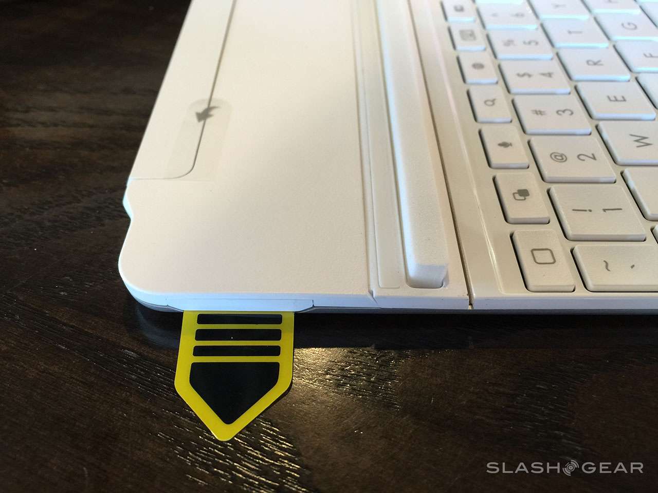 The Ultrathin uses a magnet to secure your iPad Air 2 to its hinge. This magnet is secure and strong – you can pick the iPad Air 2 up and the keyboard will go with it – the magnet is stronger than the gravity that'd otherwise keep the keyboard on the table.