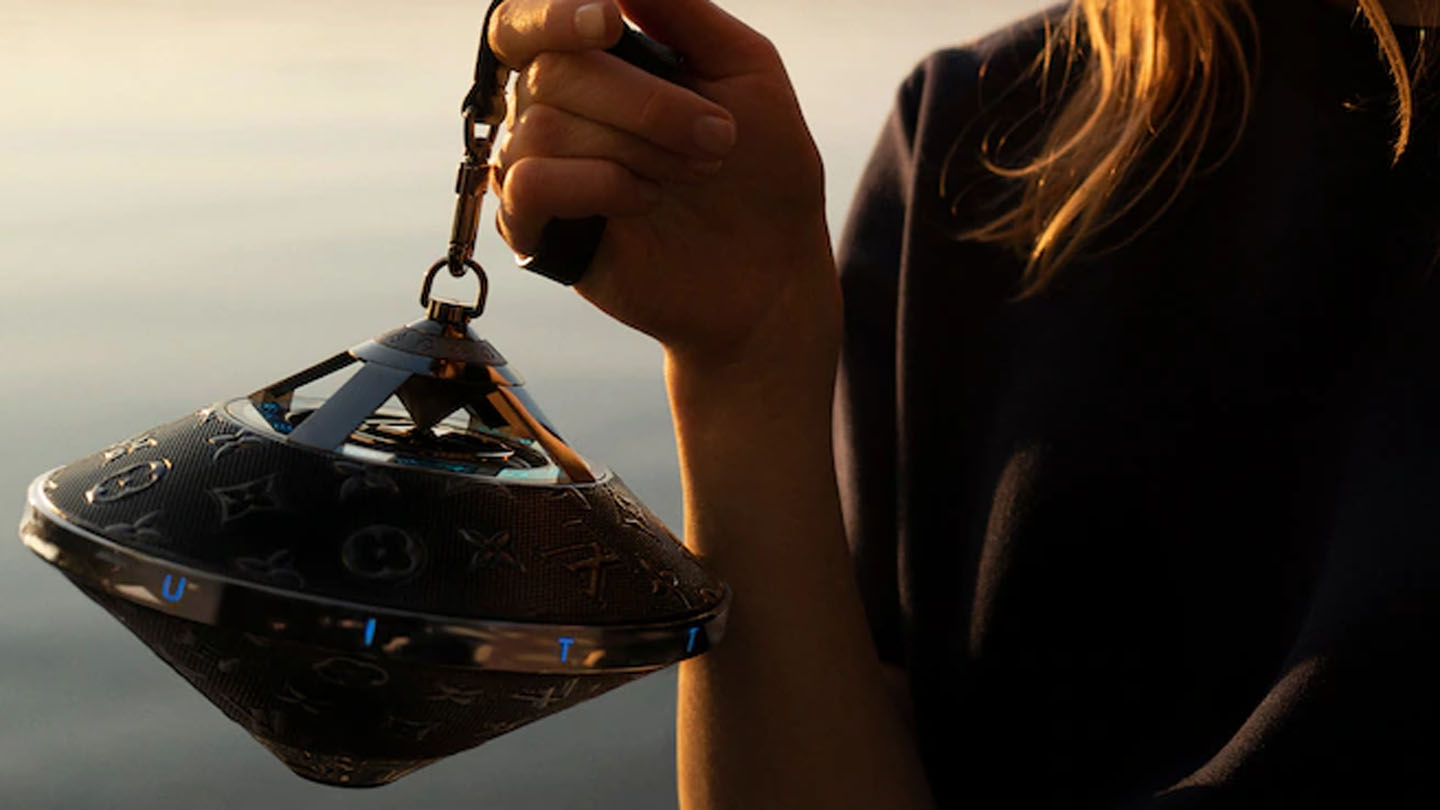 The product is called the Louis Vuitton Horizon Light Up Speaker, and it promises style, visual effects, superior sound quality, and cutting-edge technology. It has a unique style that is built like a top and resembles a UFO. It lacks a flat bottom, instead having points on the top and bottom surfaces, so it sits canted to the side when not held.