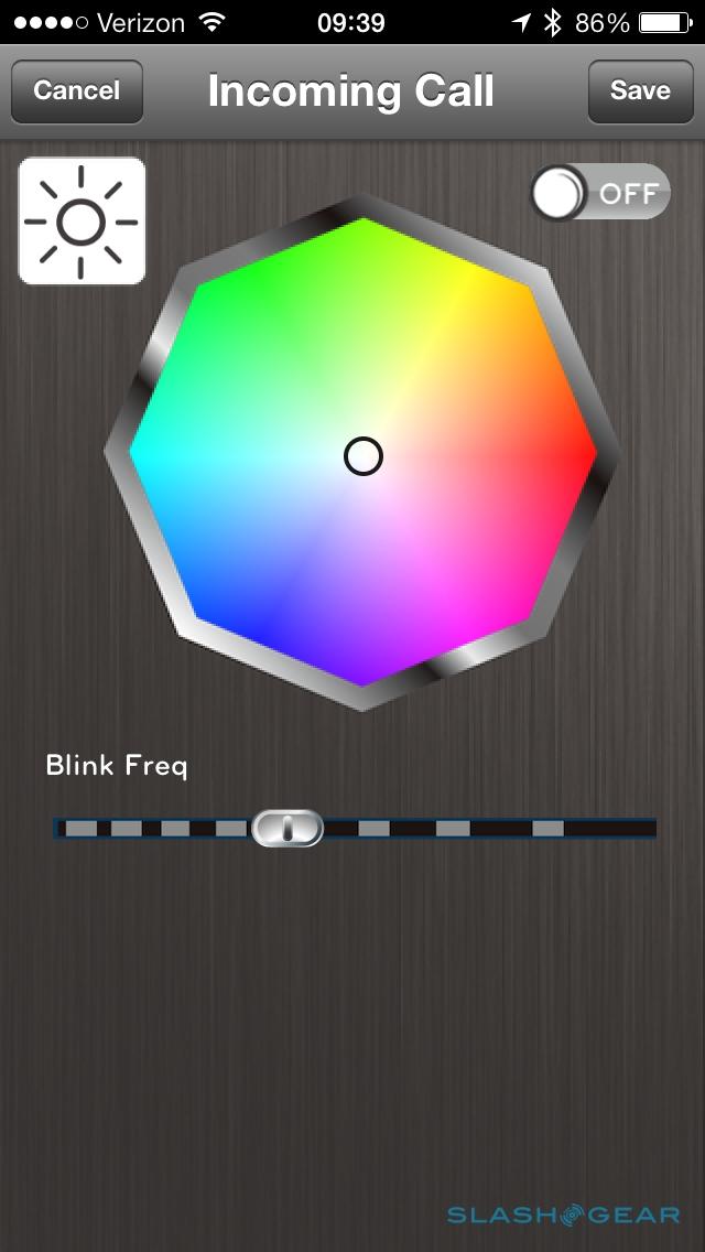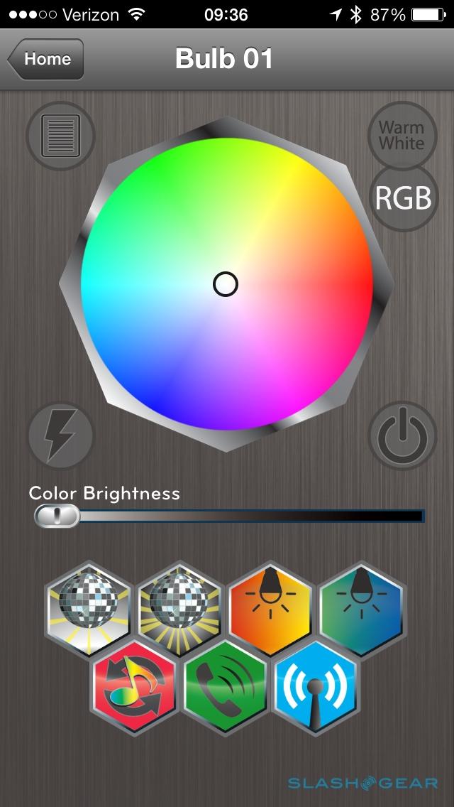 Another option is proximity control, which turns the bulb on when the phone nears. The bulb is set to auto-reconnect by default, though if you're already using the Bluetooth connection it won't be able to also "see" the bulb. Tabu quotes around 30ft of range for Bluetooth 4.0, though that will depend on how many walls are in the way; we found ourselves wishing there was some way to tune the distance at which the bulb activated, after inadvertently turning it on when in a bedside lamp while someone was trying to sleep. When you switch away from the Lumen app, then back again, the bulb communicates its current color setting.