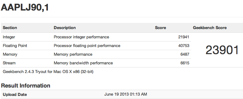 The Pro in question is listed as "AAPLJ90,1", rather than "MacPro6,1" as might be expected, and scores 23,901 overall in the Geekbench test. Geekbench is a synthetic test of processor and memory performance, one which many reviewers and system builders use to compare baseline abilities of PCs and Macs.