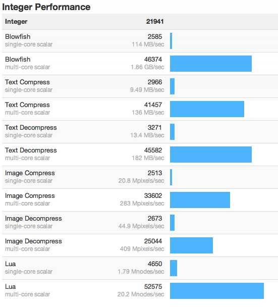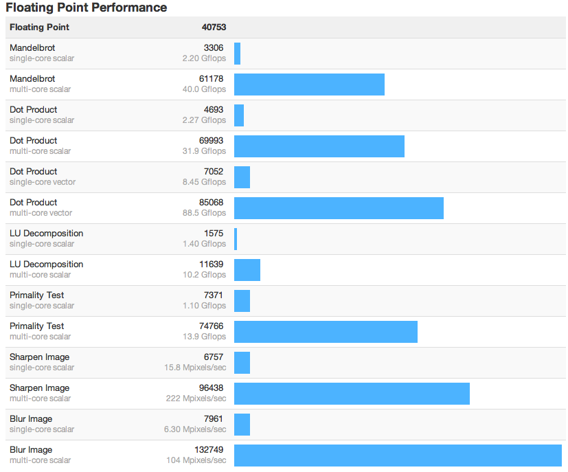 As well as the top-line advantage from the Ivy Bridge-E based Xeon E5 over the older, Westmere-based processors, the 2013 Mac Pro pulls ahead of its predecessor in most of the sub-categories tested. The difference may even become more marked as Apple refines the workstation closer to release.