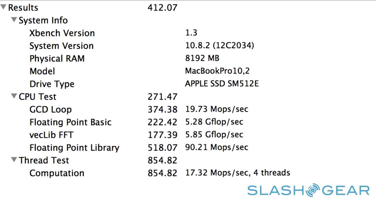 We started with Geekbench, a synthetic test of processor and memory performance. The Core i5 machine scored 6507 overall, while the Core i7 pushed that to 8238. It's worth noting that the increases weren't solely in the processor categories: the Core i7 model also recorded better memory scores, suggesting that it makes better use of the 8GB it has. Still, each is a fair step behind the 15-inch Retina model, which scored 12,970 with its 2.6GHz quadcore Core i7-3720QM and 8GB of memory. Performance was roughly on a par with the mid-2012 13-inch MacBook Air.
