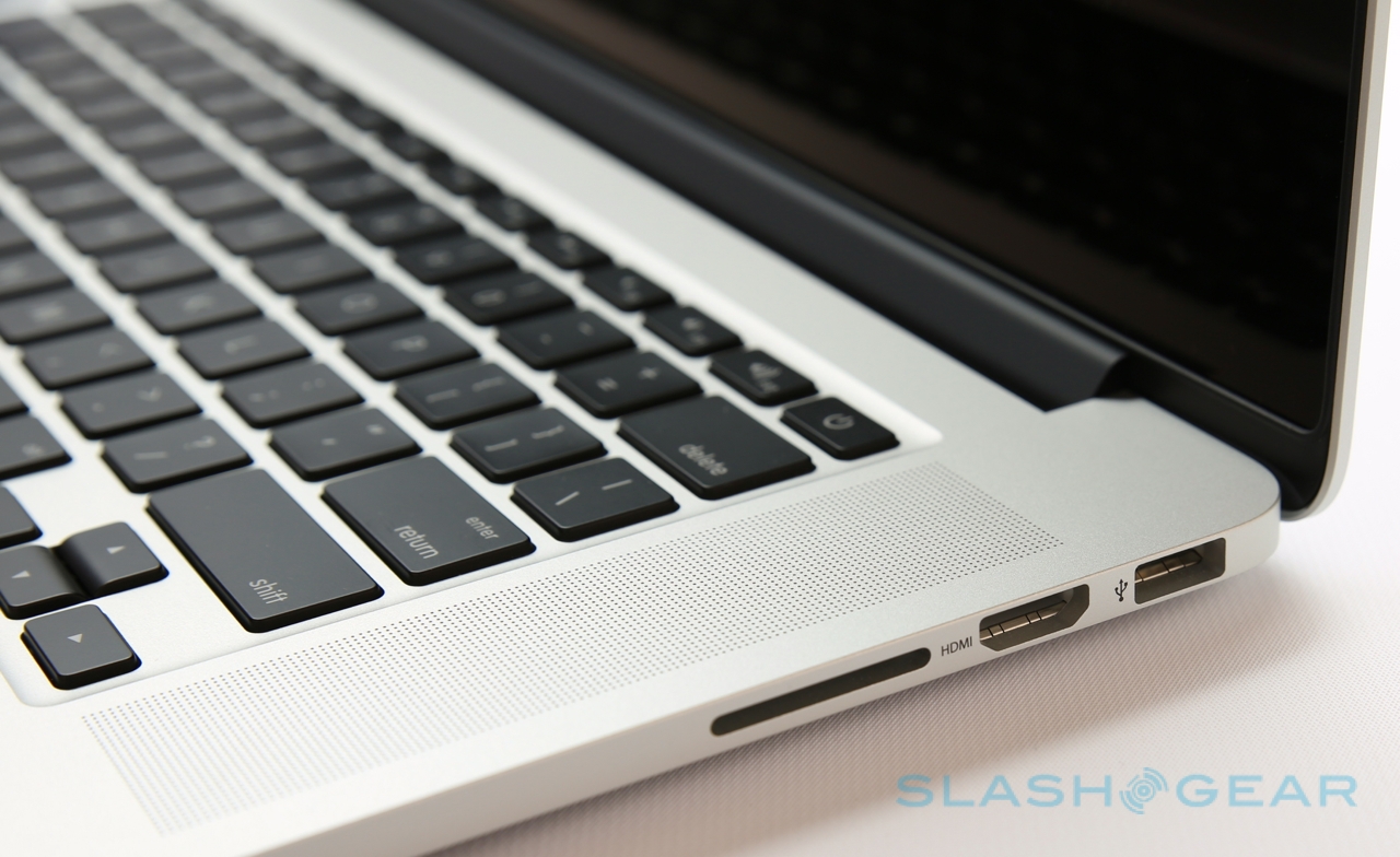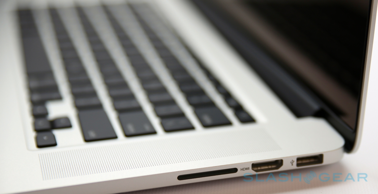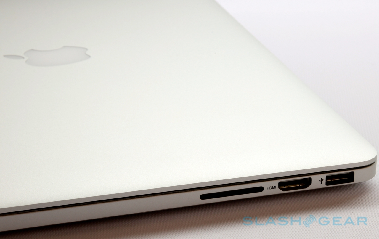 The ports you do get are – for the first time on a portable Mac – an HDMI port and two USB 3.0, the latter now conveniently split between both sides of the notebook. Dropping the optical drive has meant Apple can space things out more evenly, rather than gathering all the connections on the left panel, which means you can now plug in even bulky USB drives without having to dangle them from extension cables. Losing the ethernet port has been countered with a second Thunderbolt port.