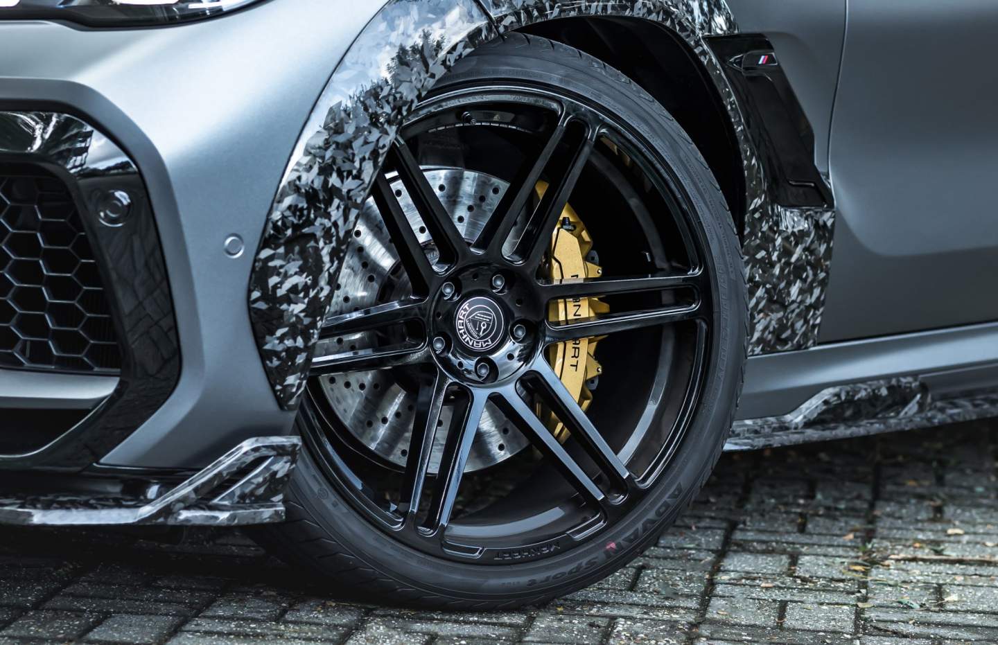 See those marble-like protrusions on the fenders and around the vehicle? Those are what Manhart calls "artistic forged carbon," and they're everywhere! According to Manhart, the irregular fiber structures have the look of polished granite or marble. You can find it on the wing mirrors, front spoiler, front grille, side skirts, wing extensions, and rear diffuser. Even the multi-part wing extensions, two-part rear spoiler, and hood are from the same forged carbon material.