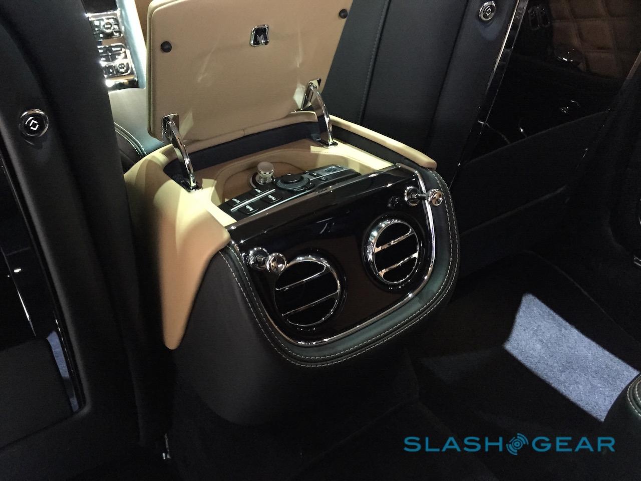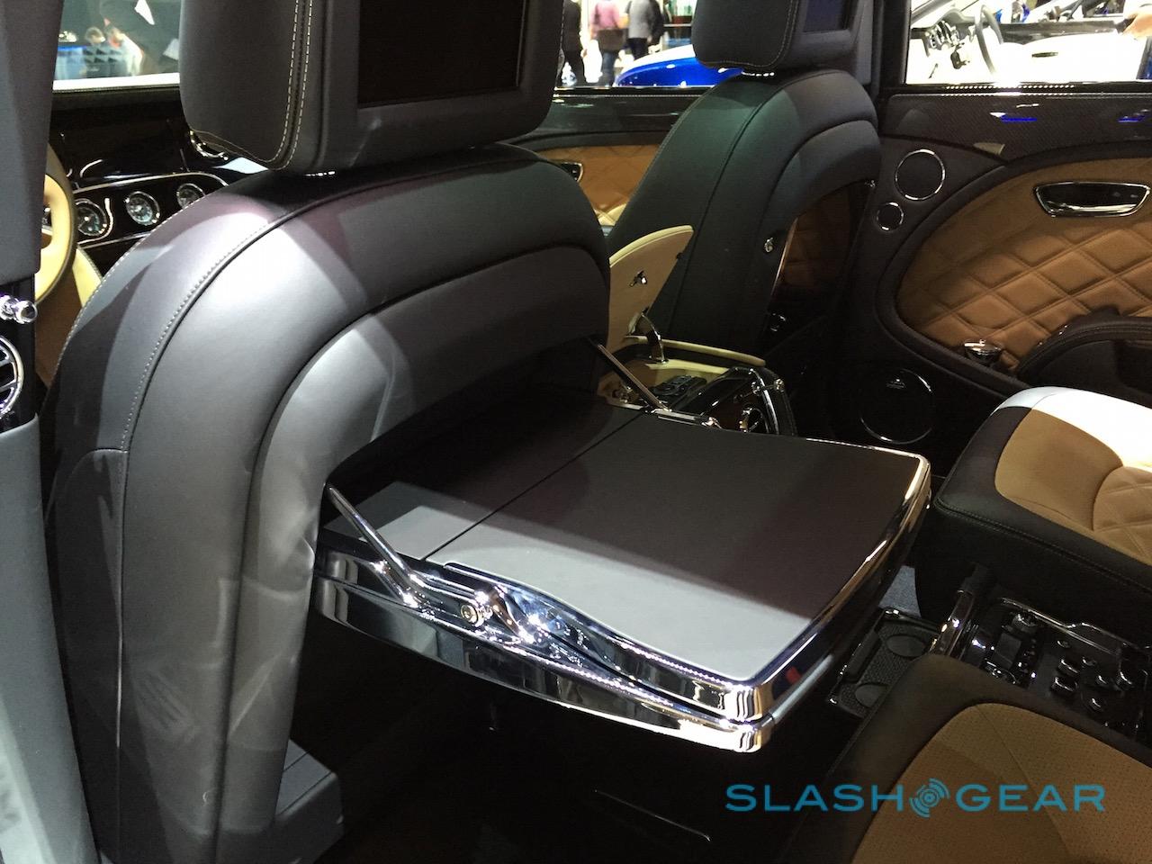 In the Bentley, the rear tables are built into the seat backs, and elevate at the touch of a button. Open them up, and there's room for iPads and wireless keyboards, too.