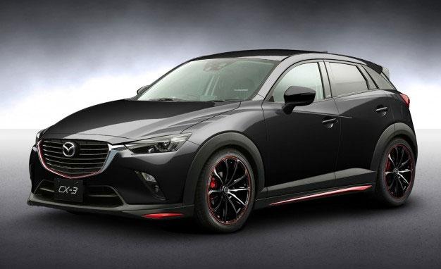 The next is the CX-3 Racing Concept, a four-door cruiser that is gussied up in fancier clothes. It has red aero tidbits on the outside, red brake calipers, and nice wheels with red strips on the rim. It looks very nice, but doesn't look like it would be at home on the racetrack.