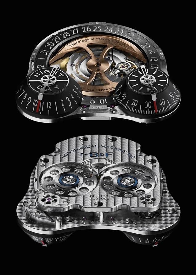The viewer's mind has to adjust to the fact that its kinetically energetic engine is displayed on the top of the watch, where the battle-axe-shaped rotor – an iconic MB&F symbol – and the oscillating balance are clearly visible. But the eye is also assailed by the twin cones that rise majestically from the three-dimensional sculpted case. It is hard to believe that this dynamic sculpture also tells the time.