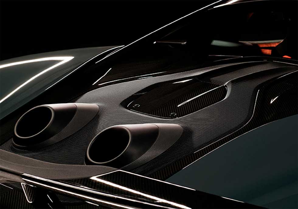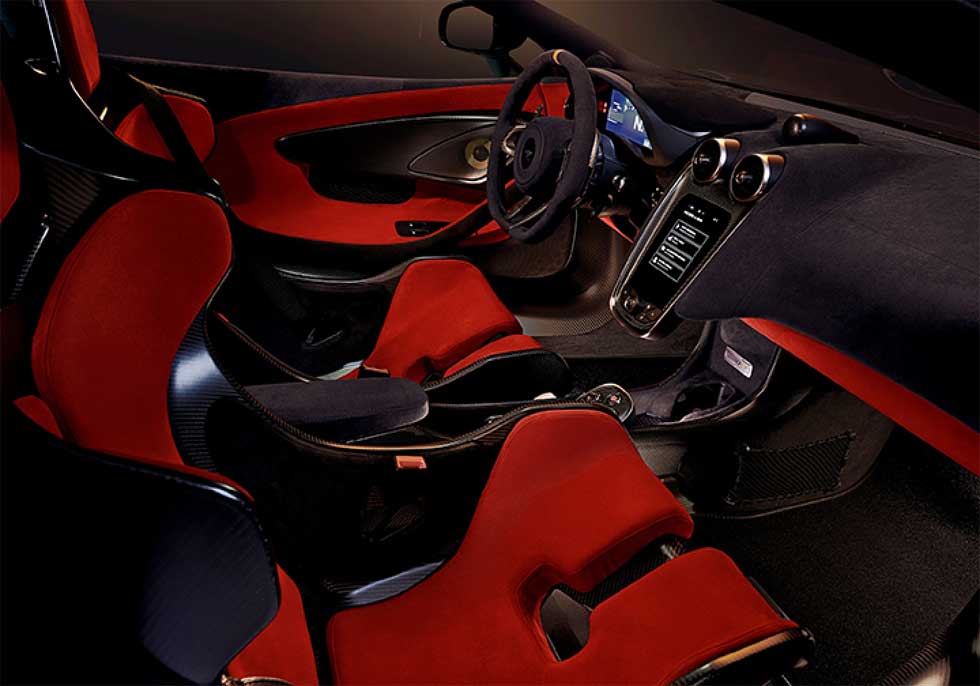 The carbon fiber bodywork is 74mm longer and has a front splitter and side sills that are new, an extended diffuser, and fixed rear wing providing 100kg of downforce at 155mph. One of the coolest bits is the top-exit exhaust system and that location along with firmer engine mounts bring more glorious engine sound into the cabin. The suspension is a forged double-wishbone system with a lightweight carbon ceramic brake system from the 720S.